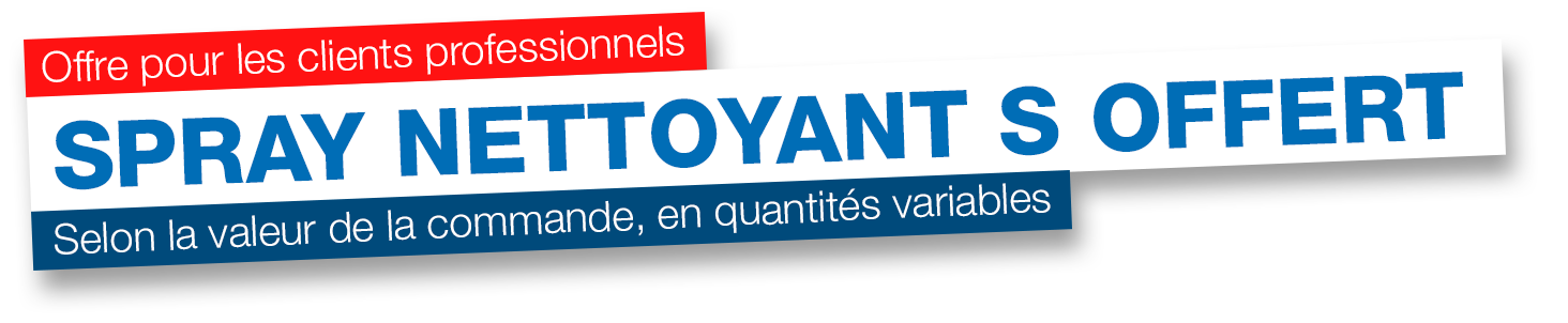 Avec votre commande sur notre boutique en ligne B2B, vous recevrez gratuitement notre Spray Cleaner S — en quantité variable selon le montant de la commande* :