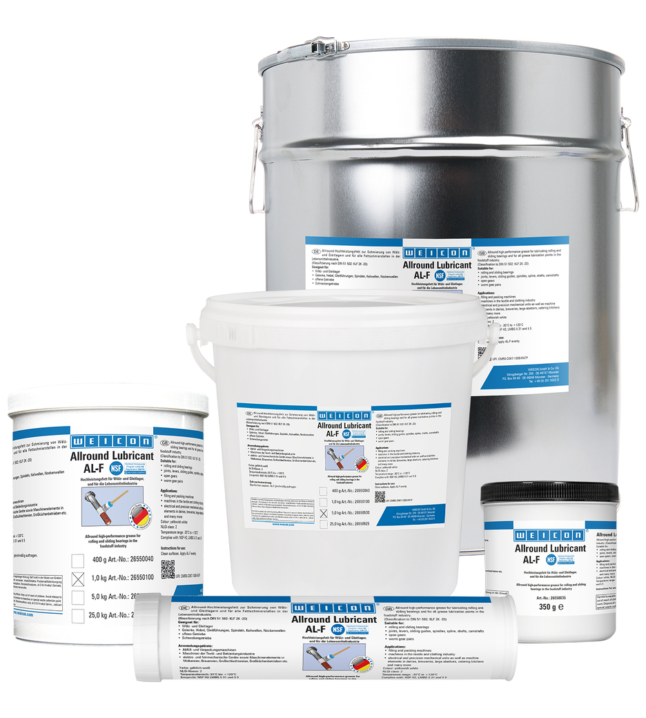 WEICON AL-F peut être utilisée pour la lubrification des roulements et paliers lisses, articulations, leviers, glissières, broches, arbres cannelés, arbres à cames, engrenages ouverts, engrenages à vis sans fin et pour tous les points de graissage. Grâce à son homologation NSF H2, la graisse convient à une utilisation dans l'industrie alimentaire.