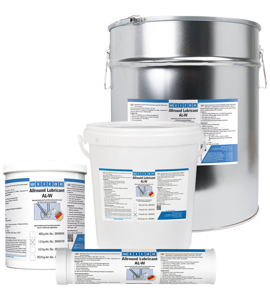 WEICON AL-W offre une protection efficace contre les liquides agressifs, comme l'eau de mer ou les eaux usées, aussi bien dans le domaine maritime que dans les entreprises humides. Le lubrifiant convient pour les roulements et les paliers lisses, même en mode de frottement mixte, les articulations, les leviers, les glissières, les broches, les arbres cannelés, les engrenages ouverts, les engrenages à vis sans fin, les chaînes et les câbles métalliques - à toutes les vitesses de glissement admissibles pour la lubrification à la graisse.