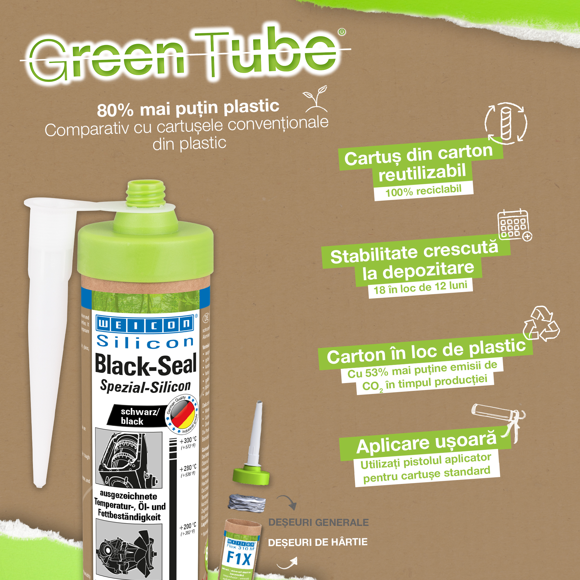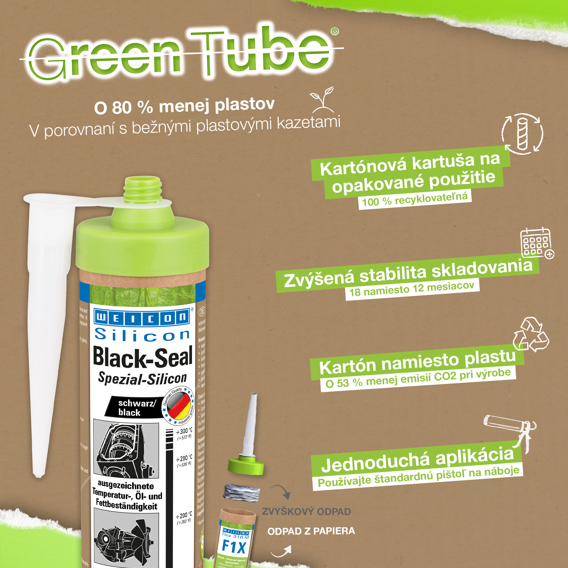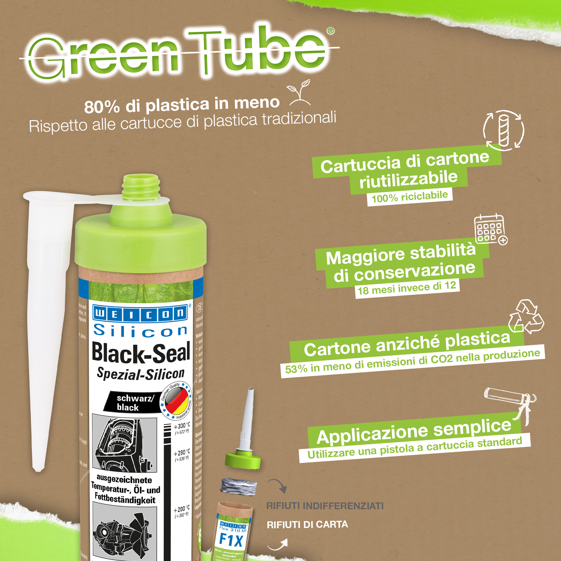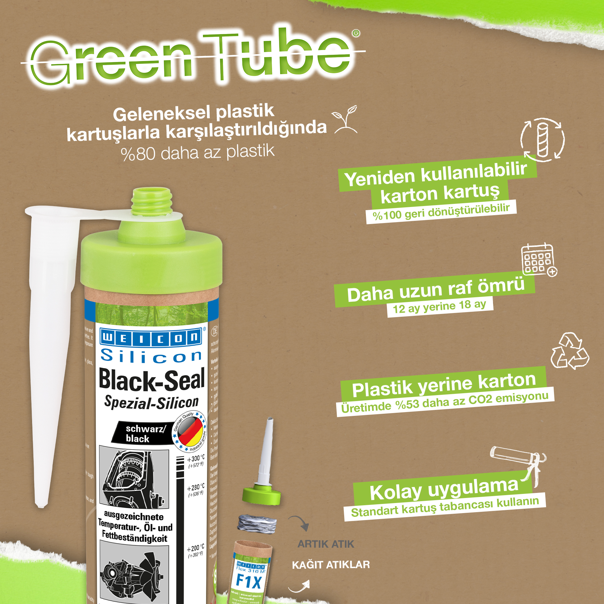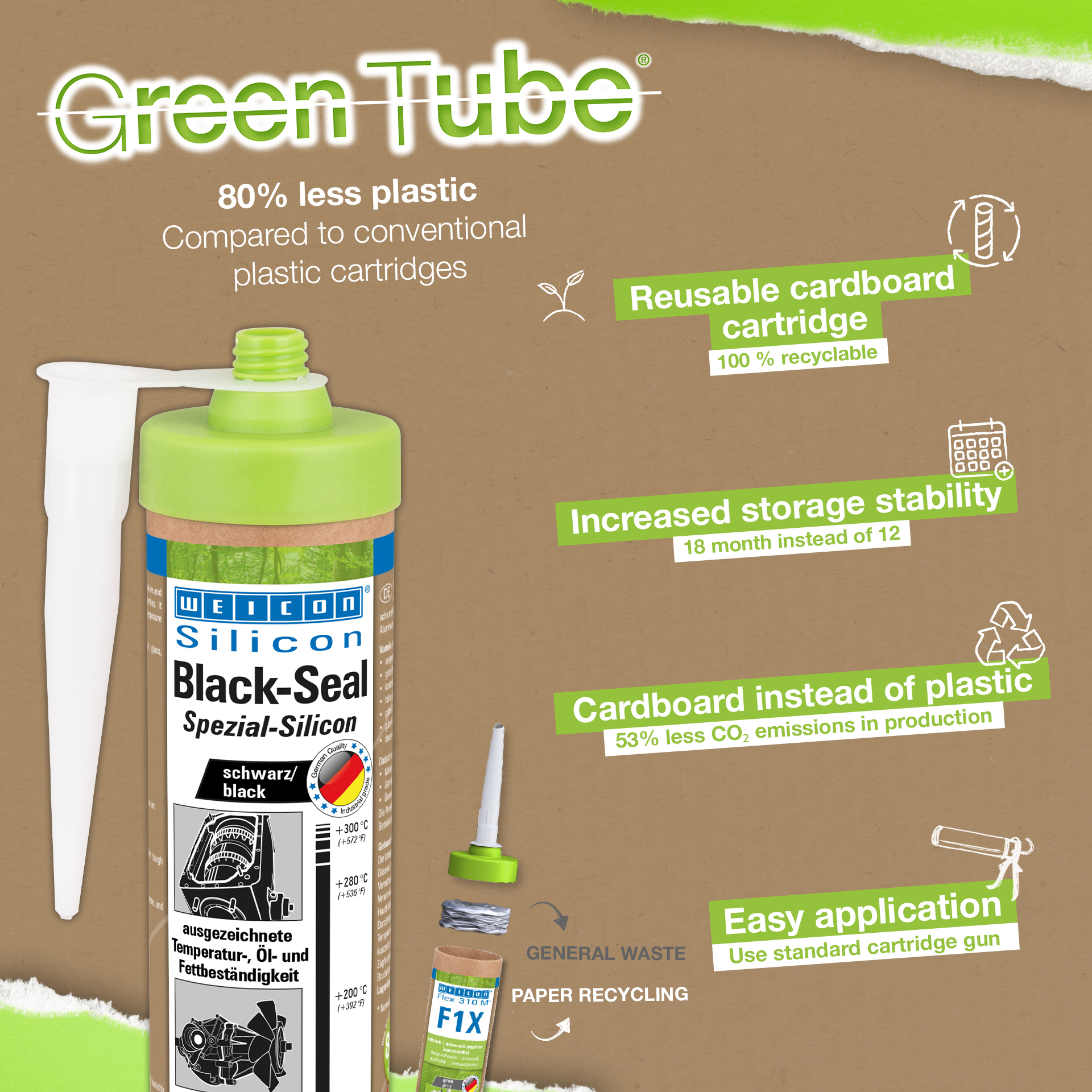 WEICON Black-Seal a une haute résistance thermique (+280 °C/+536 °F). Sans solvant, fortement adhésif, résistant à la pression et au vieillissement, il est extrêmement élastique (allongement à la rupture d'env. 500%). Black-Seal convient pour les collages et les étanchements nécessitant une résistance particulièrement forte à l'égard des huiles et des graisses. WEICON Black-Seal s'utilise sur les couvercles de boîtes à vitesses, de soupapes et de boîtiers, sur des carters et des pompes à huile, pompes à eau, boîtes à vitesses et essieux, flasques, réservoirs et récipients et dans beaucoup d'autres domaines.
