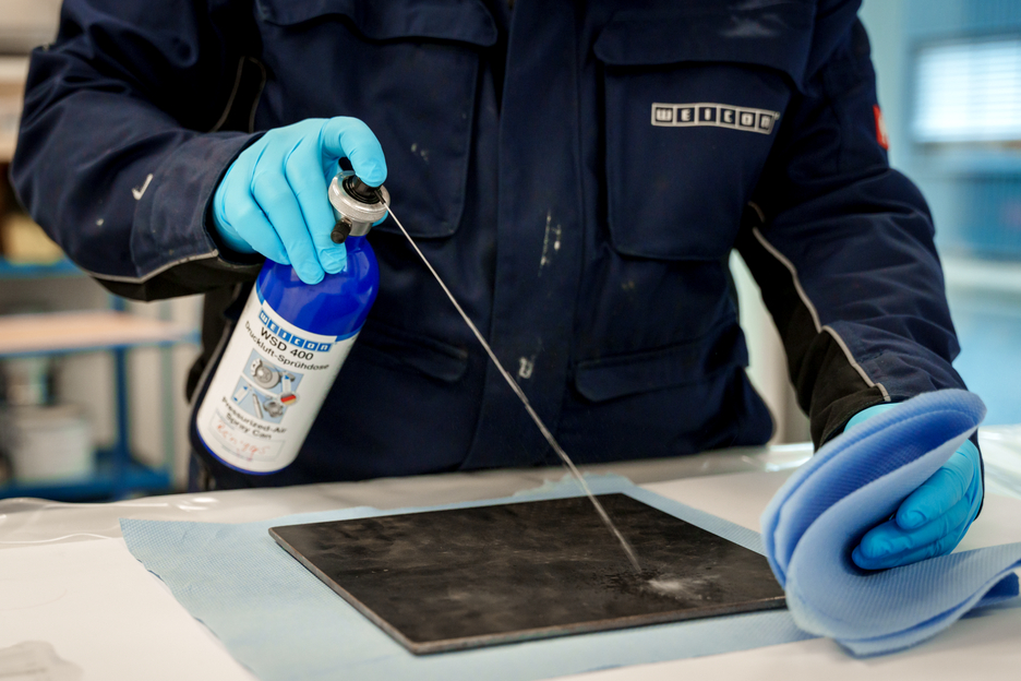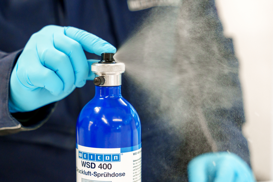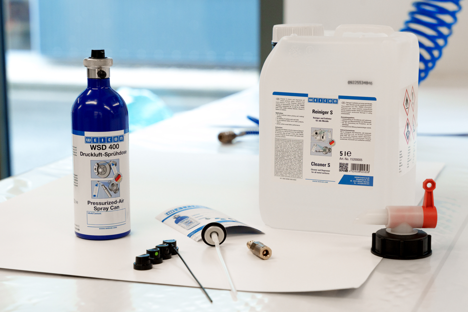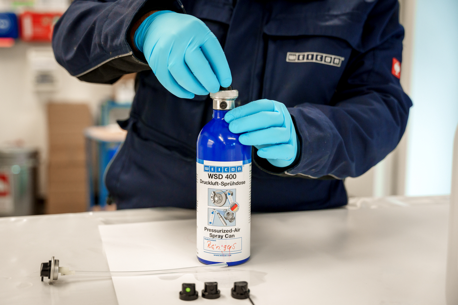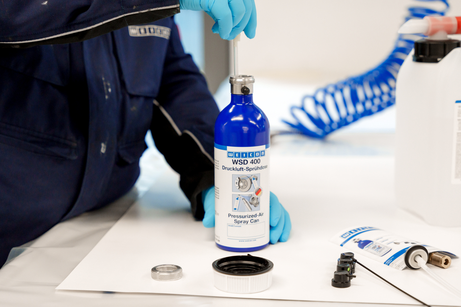 WSD 400 Bombe aérosol rechargeable, avec laquelle la plupart des agents actifs liquides WEICON peuvent être utilisés. Le remplissage avec de l'air comprimé s'effectue au moyen d'un adaptateur (accessoire) via le réseau d'air comprimé (pression de service optimale de 7,5 bar). La gamme d'accessoires pour le WSD 400 comprend, en plus de d'un adaptateur pour le remplissage sur chaque installation d'air comprimé, ainsi qu'un kit de pulvérisation avec quatre têtes de pulvérisation différentes et une vanne à bille avec tube d'aspiration.