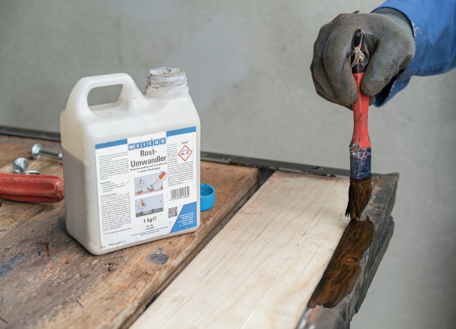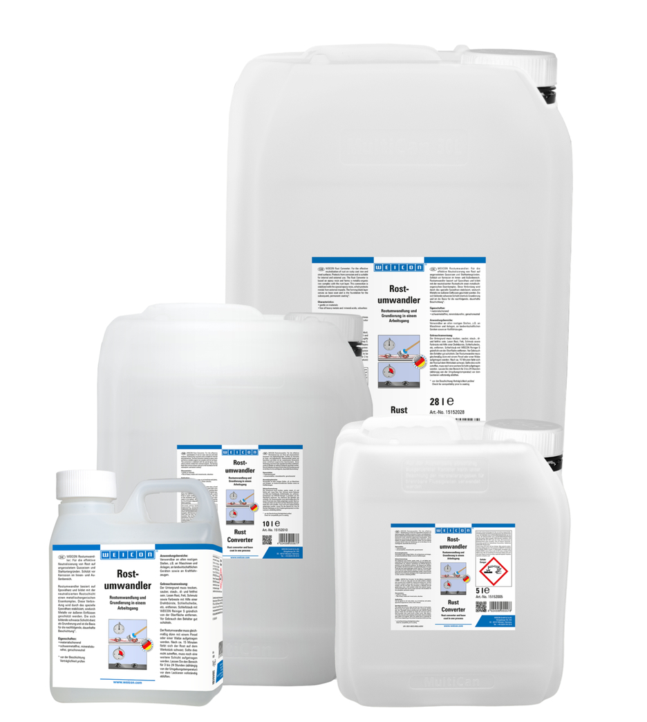 Le Convertisseur de rouille WEICON sert à neutraliser la rouille sur les supports de fer et d'acier et arrête fiablement le processus de corrosion. Grâce à sa formule active spéciale composée d'acide et de tanin, le convertisseur de rouille pénètre dans la rouille. Il transforme les oxydes de fer en une couche stable au cours d'un processus chimique et laisse en outre une protection temporaire contre la corrosion grâce au phosphate de zinc. Selon la teneur en carbone du métal, la surface traitée prend une couleur bleuâtre, brunâtre ou noire. Cette couche constitue la base idéale pour les revêtements de protection suivants, comme par exemple le Spray Zinc WEICON. Avec le Convertisseur de rouille WEICON, on obtient des résultats optimaux sur les surfaces légèrement rouillées avec un degré de rouille A et B. La rouille et les pièces détachées doivent être préalablement éliminées mécaniquement. Le convertisseur n'est actif que lorsqu'il est appliqué sur la rouille ou le métal et peut être utilisé sur une grande surface dans tous les endroits rouillés, par exemple sur les machines et les installations, sur les outils agricoles et sur les véhicules à moteur. Contrairement à d'autres transformateurs, le Convertisseur de rouille WEICON s'enlève de la surface traitée à l'eau claire et avec une éponge ou une brosse douce une fois le temps de réaction écoulé. Cela sert à éliminer les résidus qui se sont formés lors du processus de transformation.