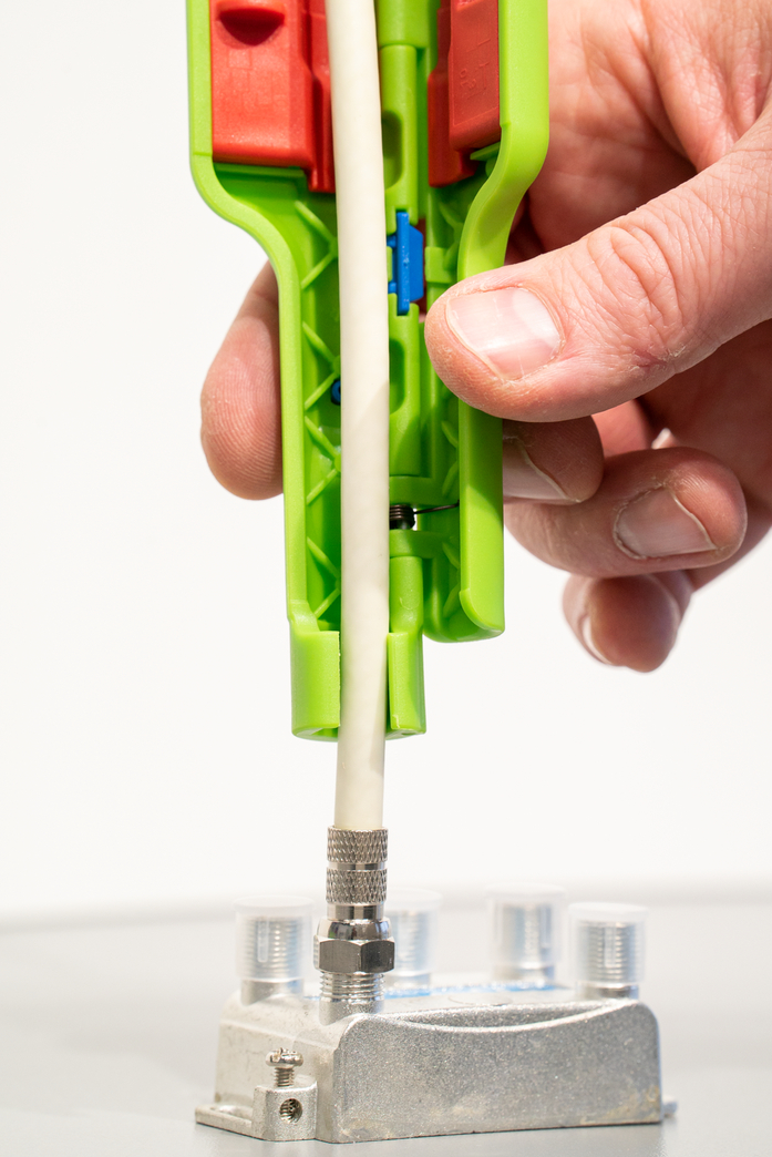 Mâchoires pour visser les fiches F à vis sur le câble Montage et démontage de fiches F sous encombrement réduit grâce au six-pans ouvert intégré avec une ouverture de clé de 11 mm (SW 11) Dénudage sans réglage des lames avec butée de longueur pour fiches F standard (6 / 4 mm), en option : Inserts de couteaux disponibles pour le dénudage à d'autres distances définies (par ex. connecteurs à compression: 6.5 / 6,5 mm)