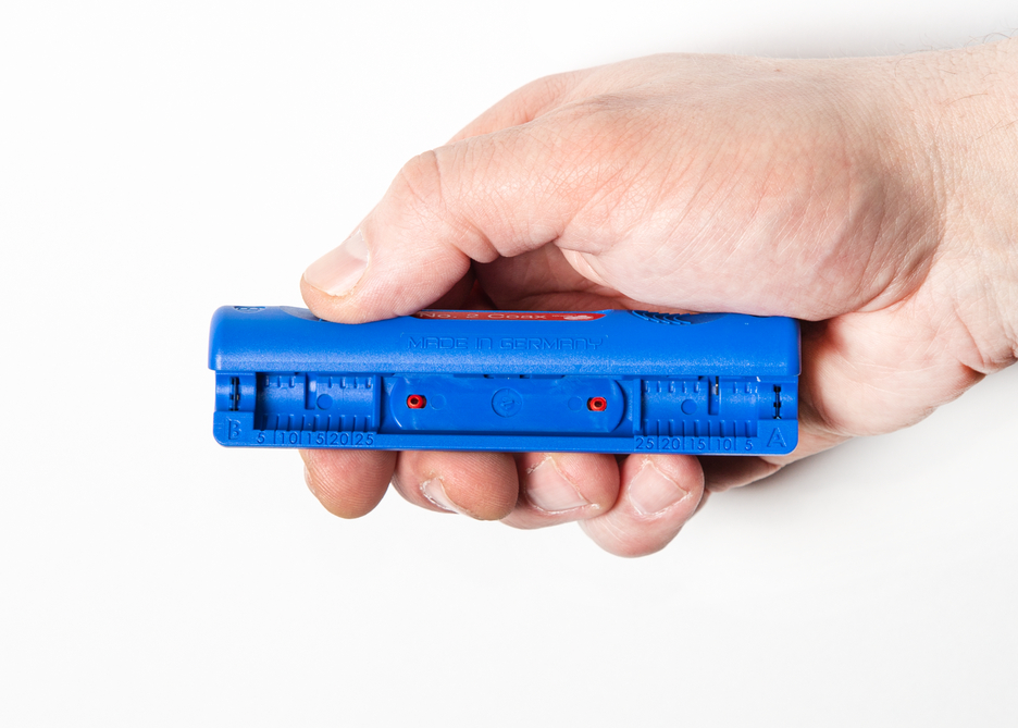 Capacité 4,8 - 7,5 mm Ø Le réglage de la profondeur de coupe n'est pas nécessaire Convient également pour les câbles multibrins Échelle des longueurs (0 à 17 mm) intégrée au boîtier Dénudage par étapes de tous les câbles coaxiaux courants