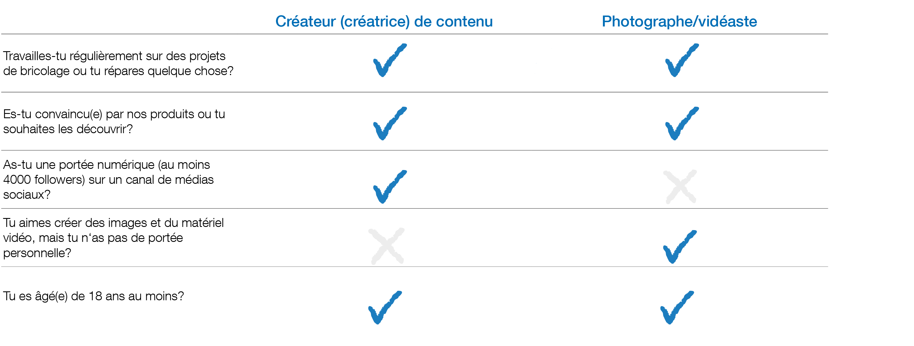 Nous sommes toujours à la recherche de partenaires de coopération qui utilisent et présentent nos produits dans leurs projets ou qui créent un contenu attrayant que nous pouvons utiliser. Que ce soit dans le domaine de l'installation électrique, de l'atelier, de l'aménagement de camping-cars ou de la ferme, nous avons certainement un produit dans notre portefeuille qui t'aidera à mener à bien ton projet. Découvre si tu es fait pour nous en tant que créateur (créatrice) de contenu ou photographe/vidéaste. Si tu souhaites faire partie de notre équipe de créateurs (créatrices), il te suffit de remplir le formulaire ci-dessous. Peut-être feras-tu bientôt partie de notre équipe!