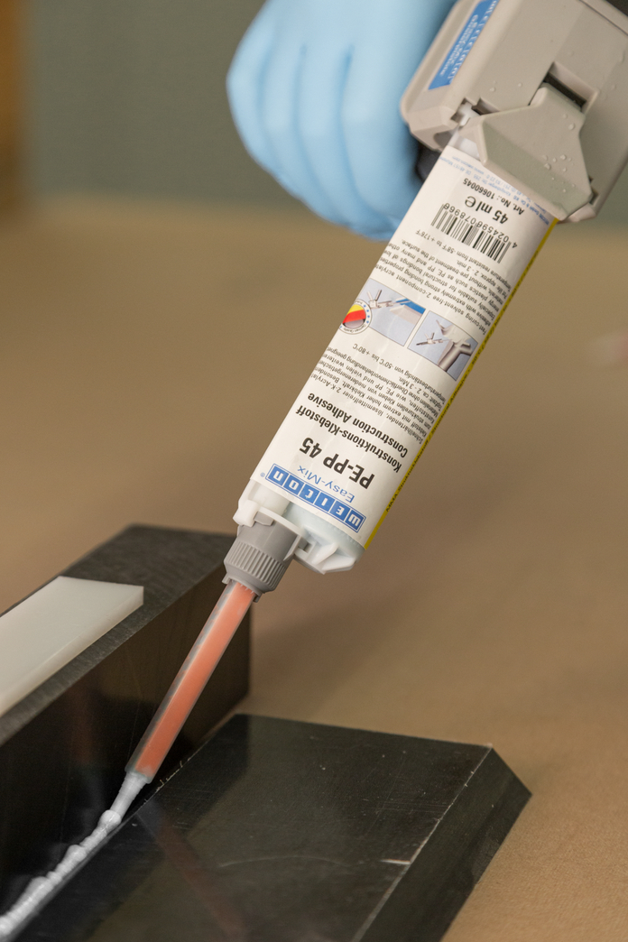 WEICON Easy-Mix PE-PP 45 est une colle structurale bicomposante à base de méthacrylate. Elle convient particulièrement au collage structural haute résistance de matières plastiques à faible énergie, p. ex. PE, PP et TPE. Il n'est pas nécessaire de procéder à un prétraitement, car le "primer" intégré à la colle active les surfaces et permet un assemblage très résistant. Pour l'application des produits Easy-Mix 50 ml, le pistolet de dosage Easy-Mix D 50 est nécessaire.