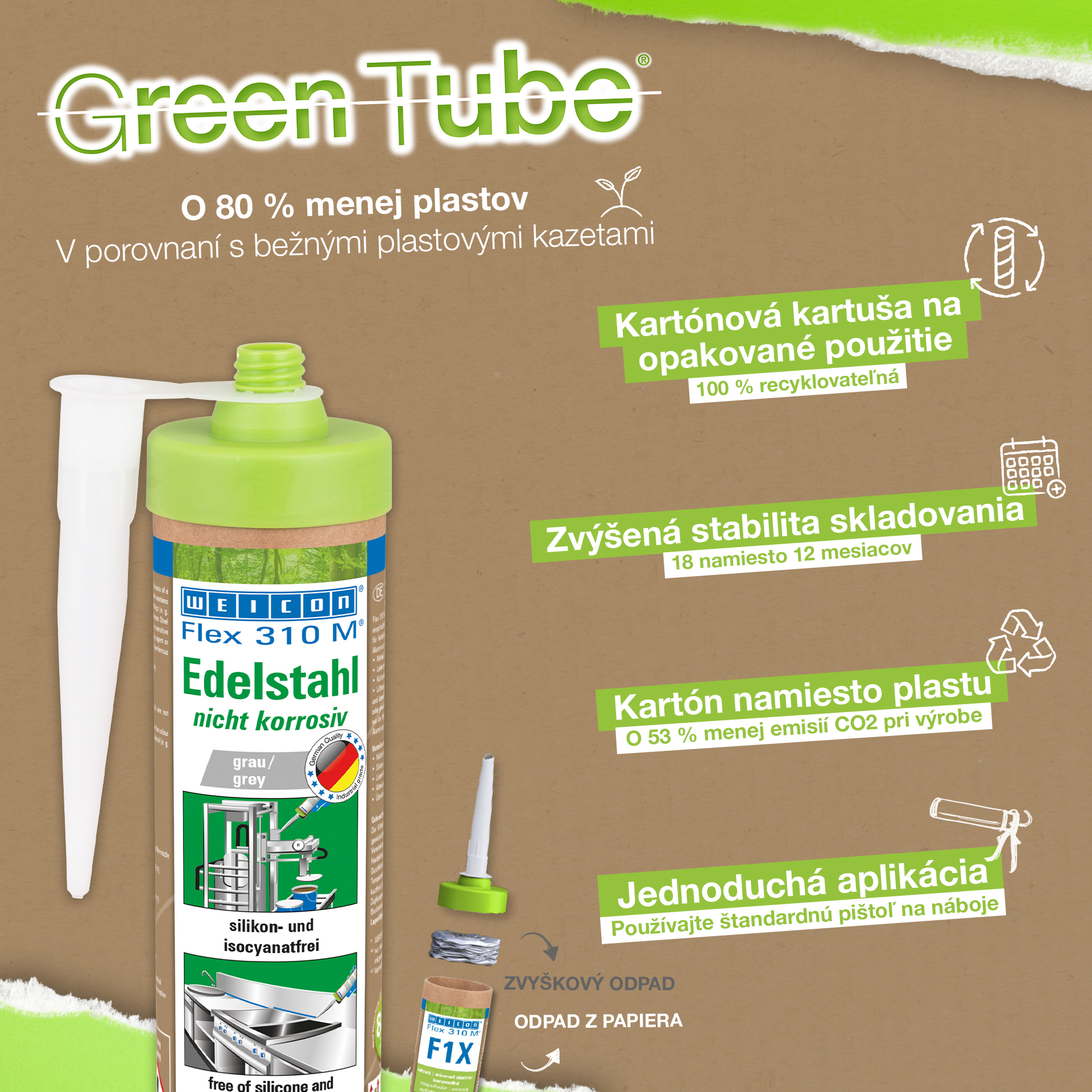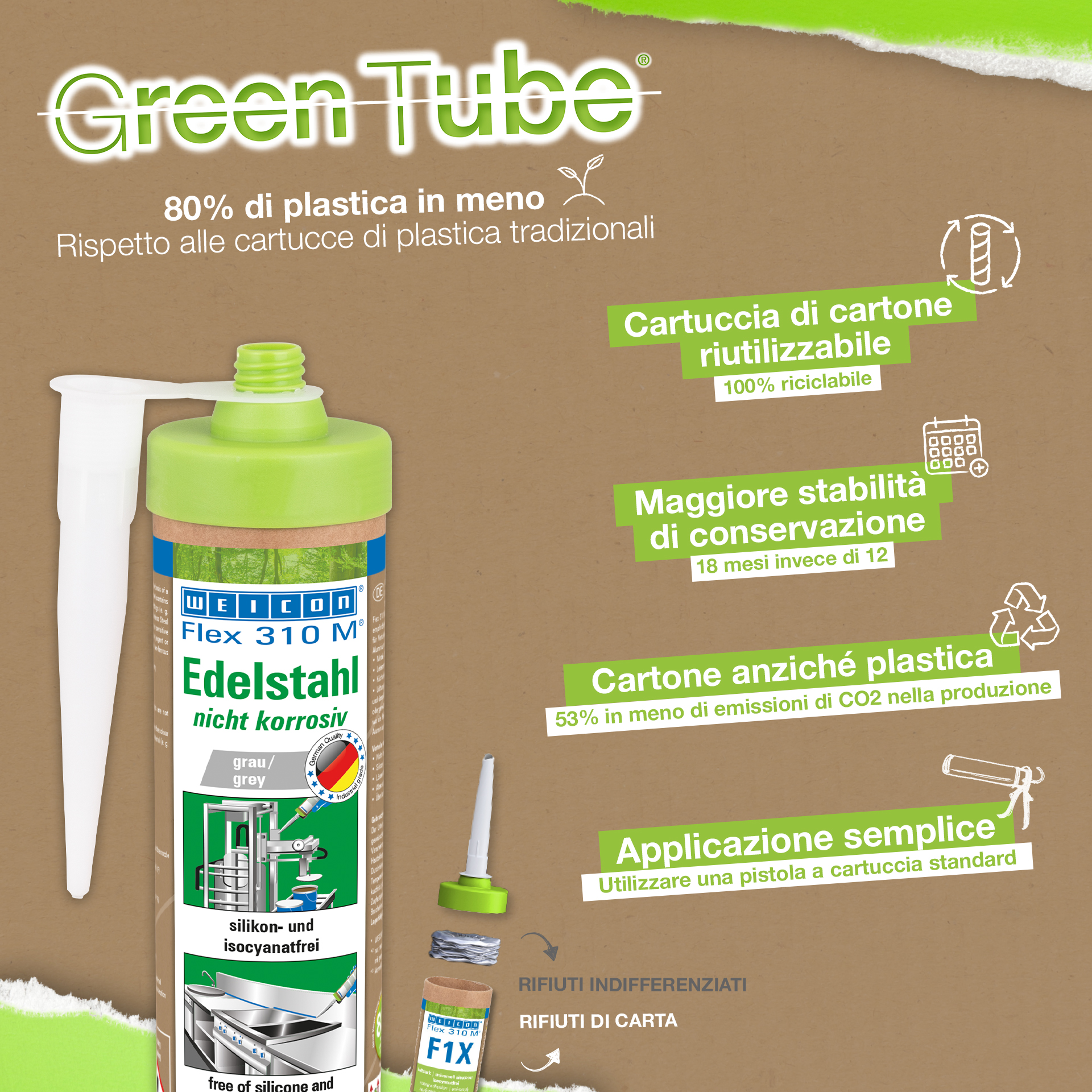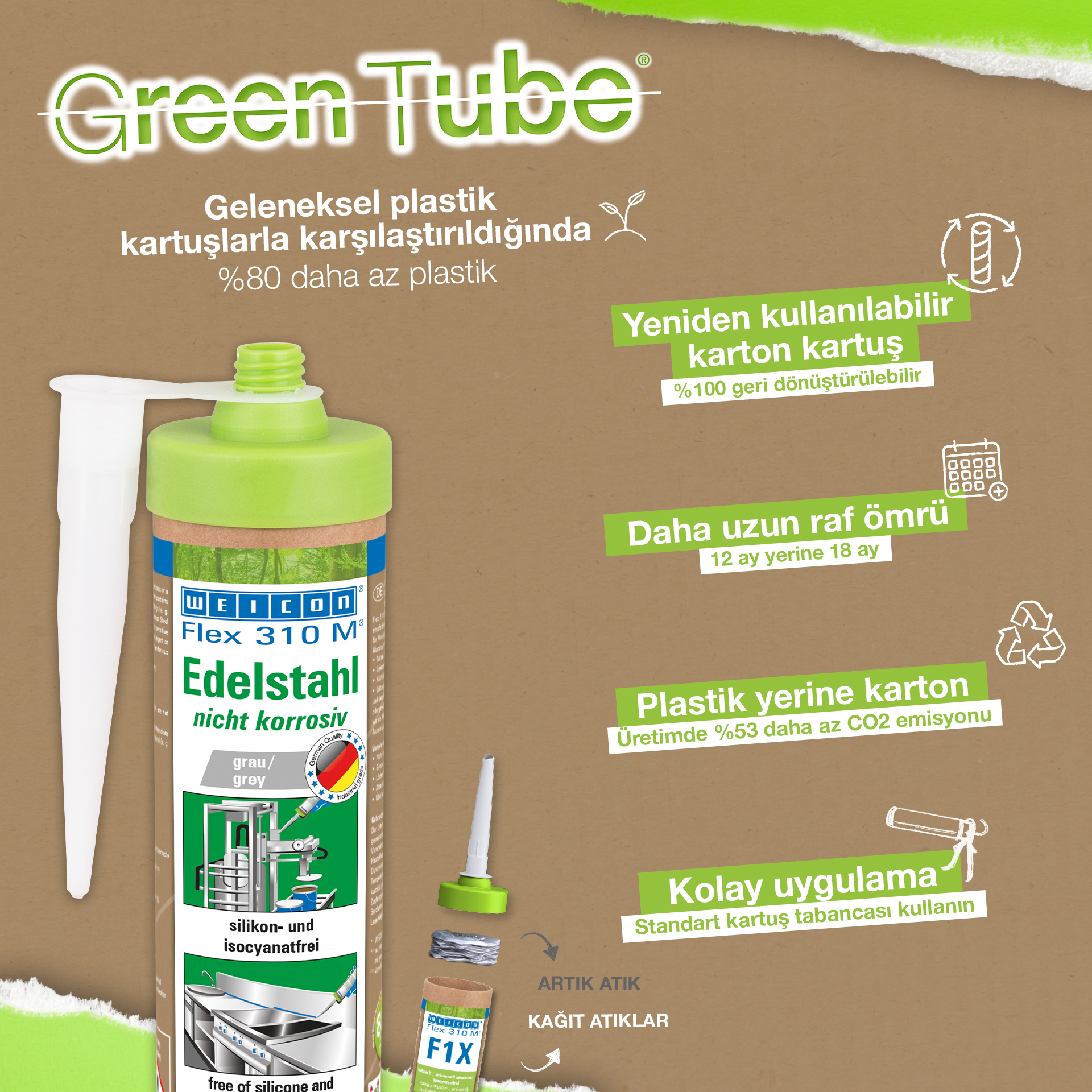 Le scellant adhésif WEICON Flex 310 M Acier Inox est non-corrosif, fortement adhésif, peut être peint «mouillé sur mouillé», il est ponçable et résistant au vieillissement et aux UV et est exempt de silicones, d'isocyanates, d'halogènes et de solvants. Le produit est certifié ISEGA et s'utilise comme adhésif en technologie alimentaire. Cet adhésif élastique à base de polymère MS convient pour coller et étancher des joints sur les métaux tels que l'acier inoxydable, l’aluminium et les métaux non-ferreux. Il s'utilise en outre partout où la couleur du scellant adhésif doit s'adapter au matériau (p.ex. acier inoxydable, aluminium, etc.) WEICON Flex 310 M Acier Inox s'utilise dans la construction métallique, la chaudronnerie, la construction d'appareils, l'industrie alimentaire, l'agencement de cuisines et le secteur sanitaire, la ventilation et la climatisation et partout où des silicones ou des produits siliconés ne conviennent pas.