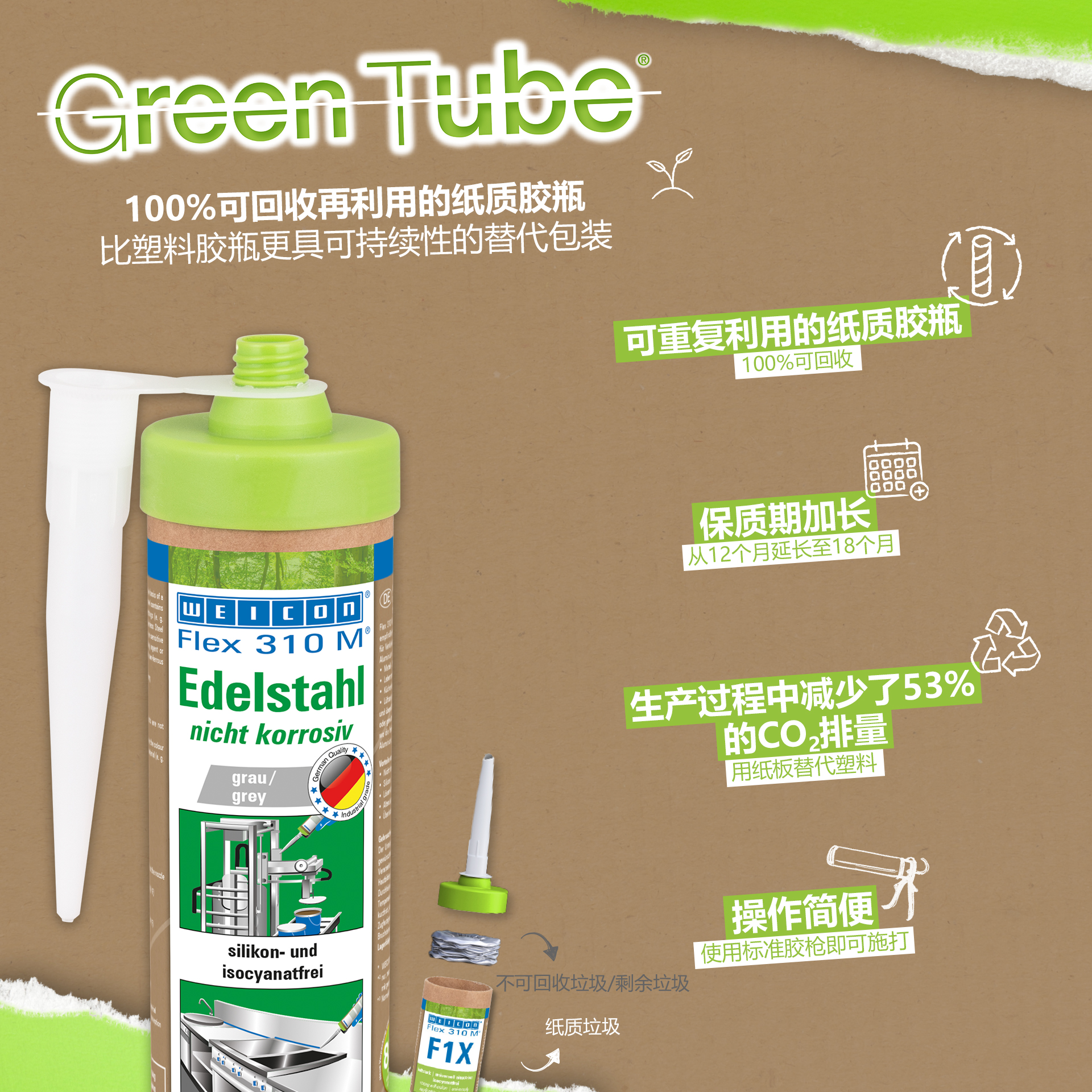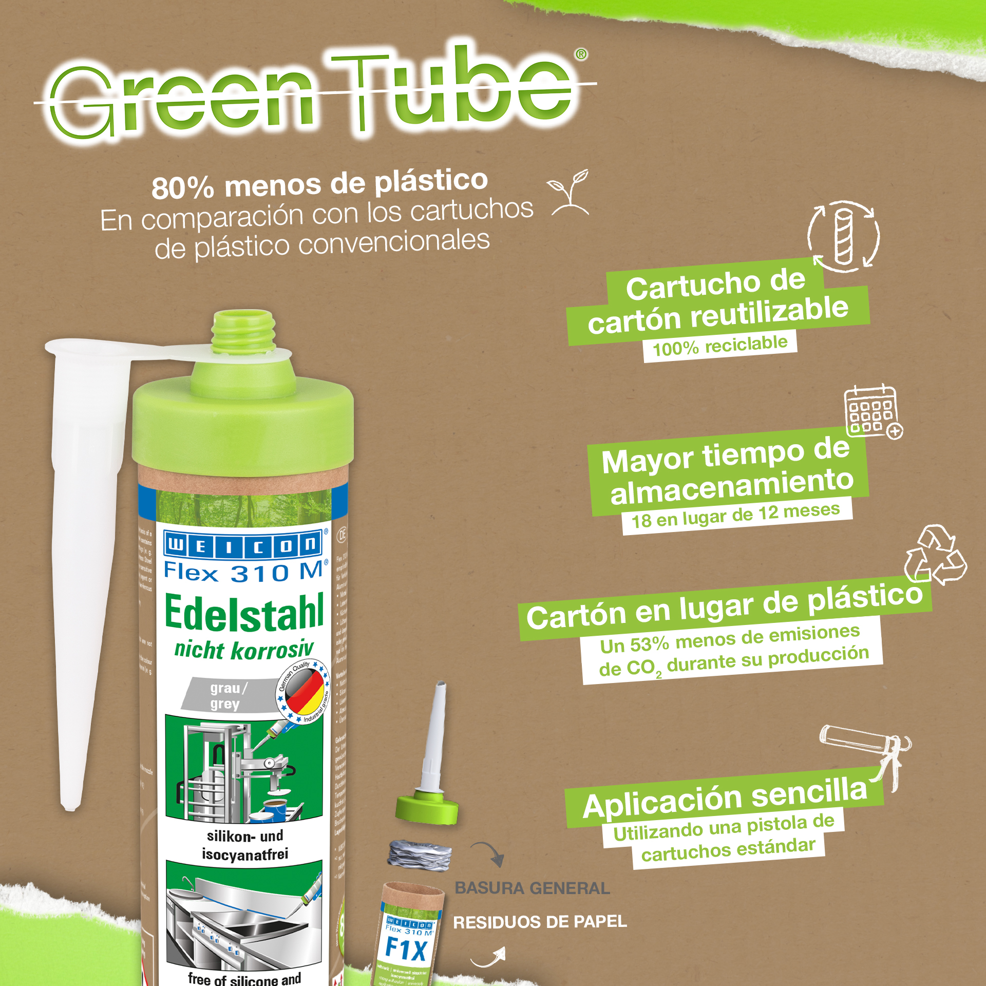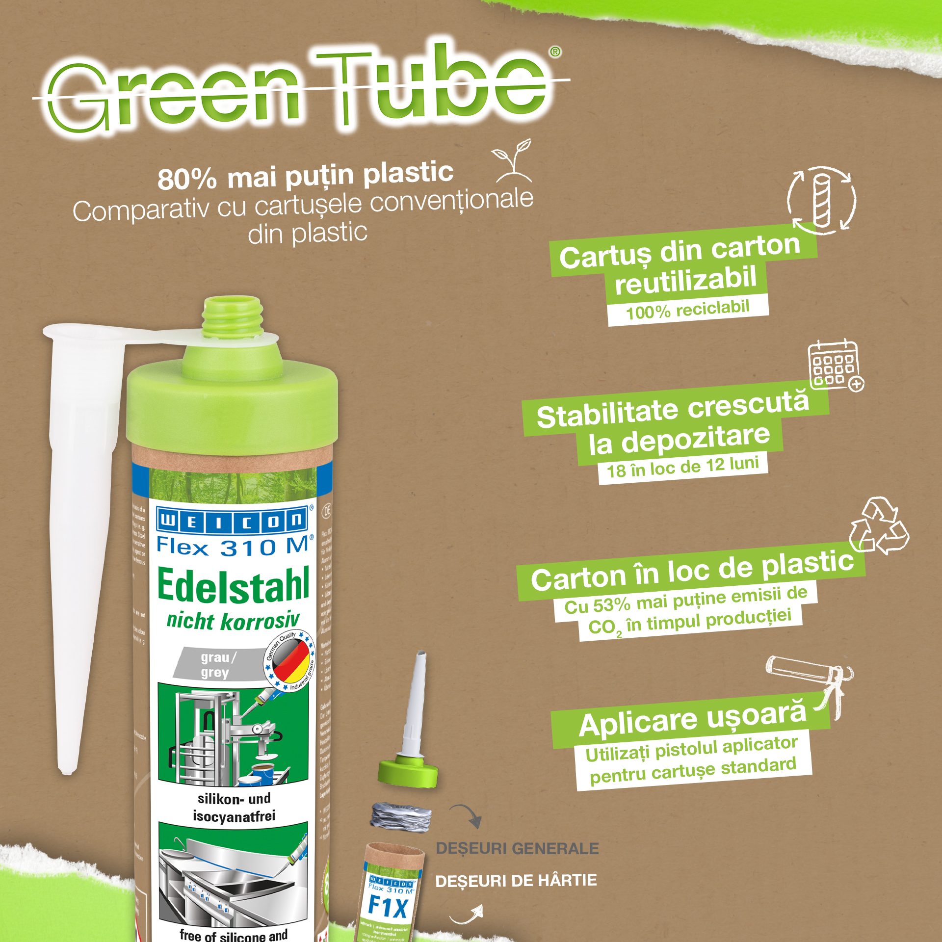 Le scellant adhésif WEICON Flex 310 M Acier Inox est non-corrosif, fortement adhésif, peut être peint «mouillé sur mouillé», il est ponçable et résistant au vieillissement et aux UV et est exempt de silicones, d'isocyanates, d'halogènes et de solvants. Le produit est certifié ISEGA et s'utilise comme adhésif en technologie alimentaire. Cet adhésif élastique à base de polymère MS convient pour coller et étancher des joints sur les métaux tels que l'acier inoxydable, l’aluminium et les métaux non-ferreux. Il s'utilise en outre partout où la couleur du scellant adhésif doit s'adapter au matériau (p.ex. acier inoxydable, aluminium, etc.) WEICON Flex 310 M Acier Inox s'utilise dans la construction métallique, la chaudronnerie, la construction d'appareils, l'industrie alimentaire, l'agencement de cuisines et le secteur sanitaire, la ventilation et la climatisation et partout où des silicones ou des produits siliconés ne conviennent pas.