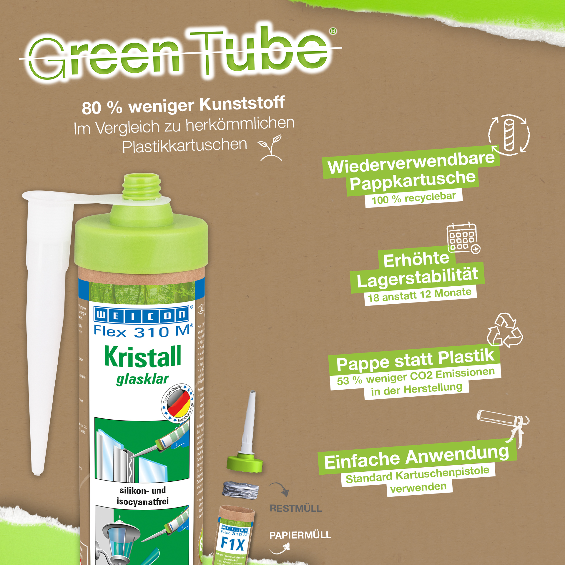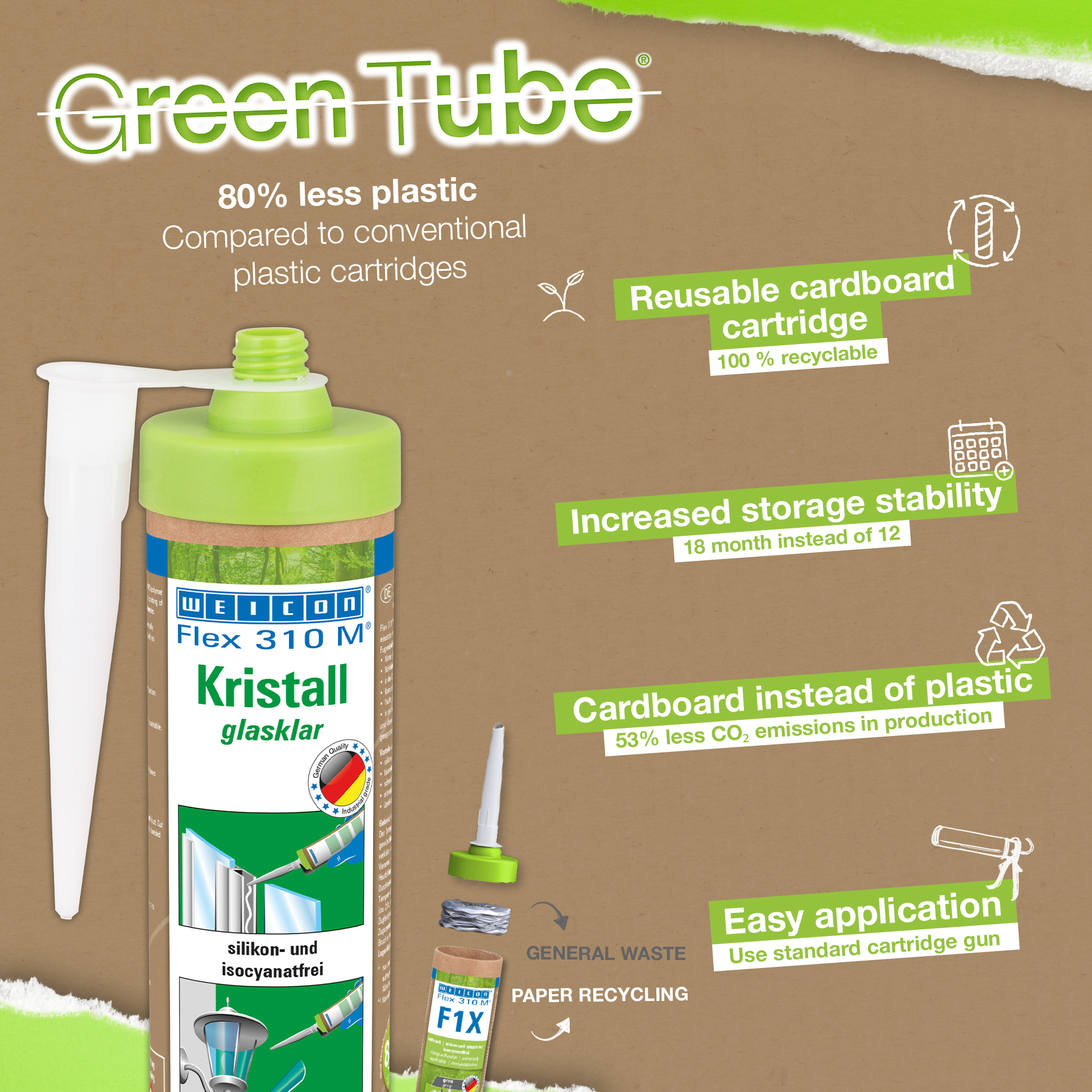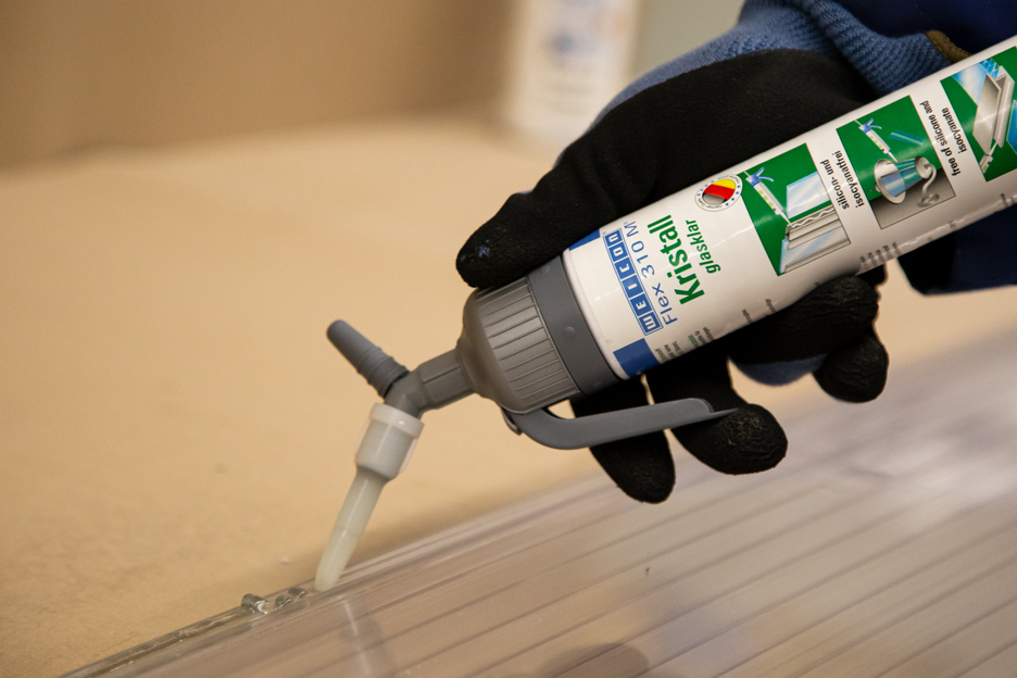 WEICON Flex 310 M Cristal est transparent, fortement adhésif, peut être peint «mouillé sur mouillé» et poncé. Il possède une excellente résistance au vieillissement, une bonne stabilité aux UV, il est résistant à l'eau douce et à l'eau salée, exempt de silicone, d'isocyanate, d'halogènes et de solvants. Il est certifié ISEGA et s'utilise comme adhésif en technologie alimentaire. Flex 310 M Cristal est un adhésif élastique à base de Polymères MS et convient pour assembler le verre, le PC*, le PMMA* et le verre acrylique*, les métaux, de nombreuses matières plastiques, la céramique, le bois et la pierre. Une fois durci, le produit est limpide et convient particulièrement pour les assemblages élastiques où l'adhésif peut ou doit rester invisible. Il s'utilise dans la transformation des matières plastiques, la construction métallique, la chaudronnerie, la construction d'appareils, la ventilation et la climatisation, l'industrie électrique et des luminaires, la construction de stands d'exposition et l'agencement de magasins et partout où les silicones ou les produits siliconés sont inappropriés. (* = Coller seulement sans tension)