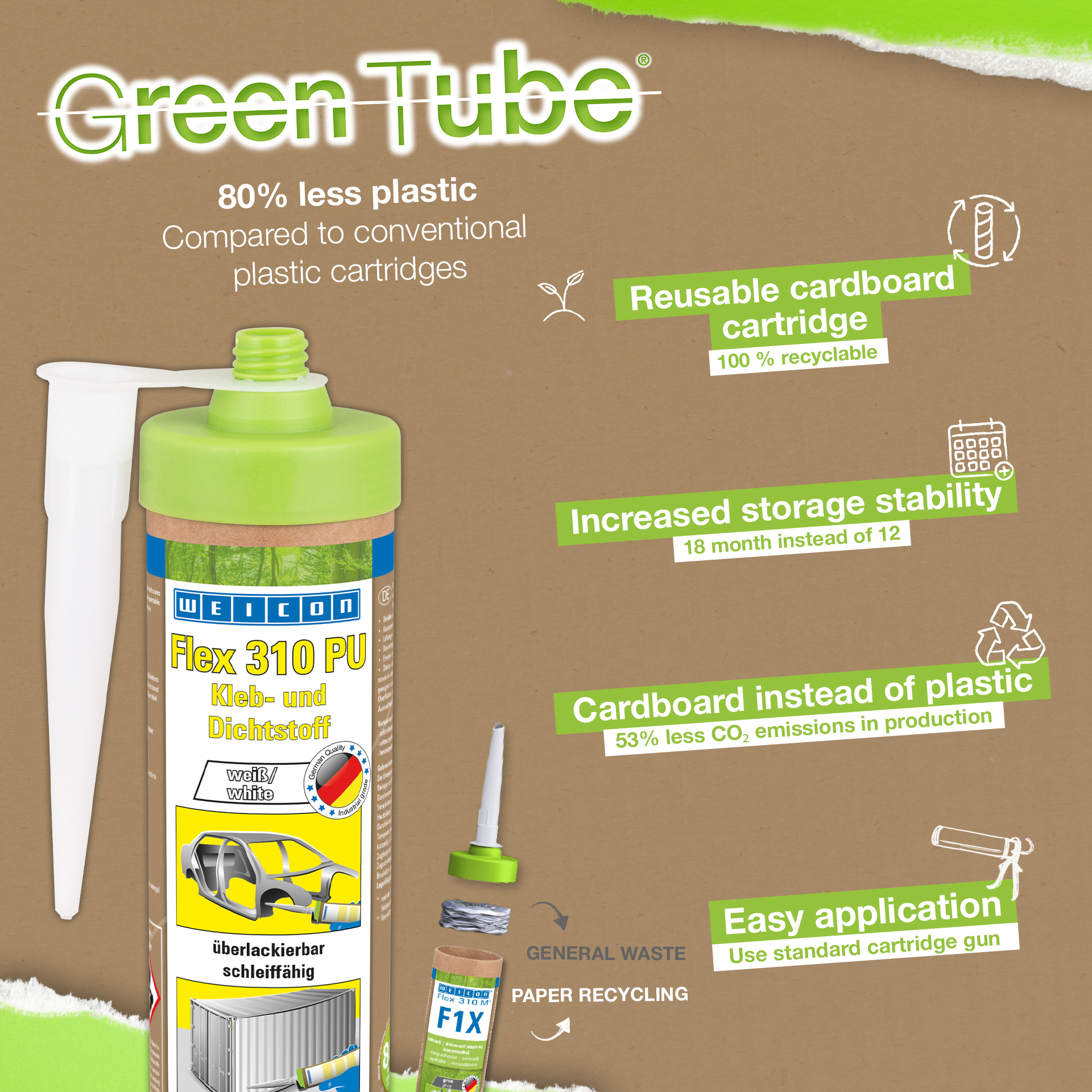 Flex 310 PU est durablement élastique, possède une forte adhérence, peut être peint, résiste aux intempéries, aux UV, à l‘eau douce et à l‘eau salée. Il est exempt de silicones. Ce produit est un scellant adhésif élastique à base de polyuréthane (PUR) permettant de réaliser des collages et des scellements sur de nombreux matériaux, comme les métaux, les matières plastiques, la céramique, le bois, le verre et la pierre. Il s‘utilise en chaudronnerie, dans la construction d‘appareils, en carrosserie, dans la construction de véhicules et de containers, la ventilation et la climatisation, la technique des matières plastiques, l‘industrie énergétique et électrique et partout où des silicones ou des produits siliconés ne conviennent pas.