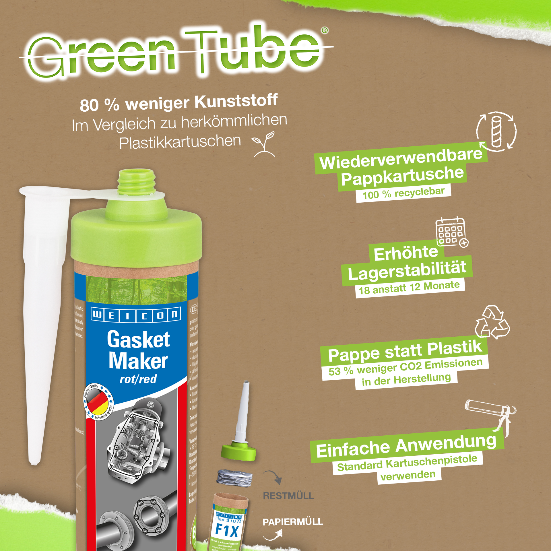 WEICON Gasket Maker est un mastic d'étanchéité spécial à forte adhérence et à élasticité permanente, qui durcit pratiquement sans retrait sous l'effet de l'humidité de l'air. Gasket Maker adhère très bien sur l'acier, l'aluminium, le verre, la céramique et de nombreux autres matériaux. Gasket Maker présente une excellente résistance à la température, à l'huile et à la graisse, il est résistant à la pression, stable aux UV, résistant au vieillissement et durablement élastique. Ce produit d'étanchéité spécial peut être utilisé sur les moteurs et les pompes à eau, les boîtes de vitesses et les essieux, les carters d'huile, etc.