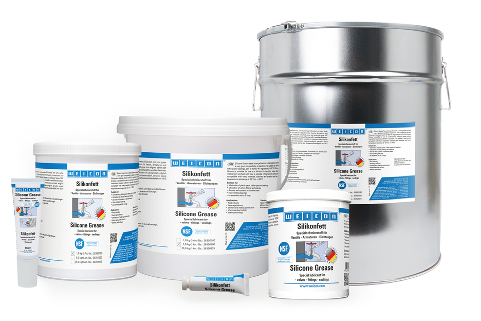 La Graisse Silicone WEICON est très adhérente et transparente et présente une très bonne compatibilité avec les matières plastiques. En raison de l'enregistrement NSF H1, elle convient comme lubrifiant pour les vannes, la robinetterie et les joints dans les domaines sensibles. La graisse est conforme aux directives KTW de l'Office fédéral de l'environnement pour le contact avec l'eau potable. Elle peut être utilisée dans la technique alimentaire, dans l'industrie des boissons, dans le domaine sanitaire et du chauffage, dans l'industrie pharmaceutique et dans la technique d'étanchéité. La graisse silicone WEICON est testée par le BAM et évaluée du point de vue de la sécurité - voir la fiche M 034-1 "Liste des matériaux non métalliques pour l'utilisation dans l'oxygène" (DGUV Information 213-075) de la BG RCI. La graisse est particulièrement bien tolérée par les matériaux, sans odeur ni goût et résiste à des températures de -50 °C à +200 °C. La Graisse Silicone WEICON convient pour la lubrification de pièces en plastique, de pièces et de joints en caoutchouc, pour la lubrification de vannes, de robinets et de joints, pour les appareils et les installations et comme aide au montage de joints toriques.