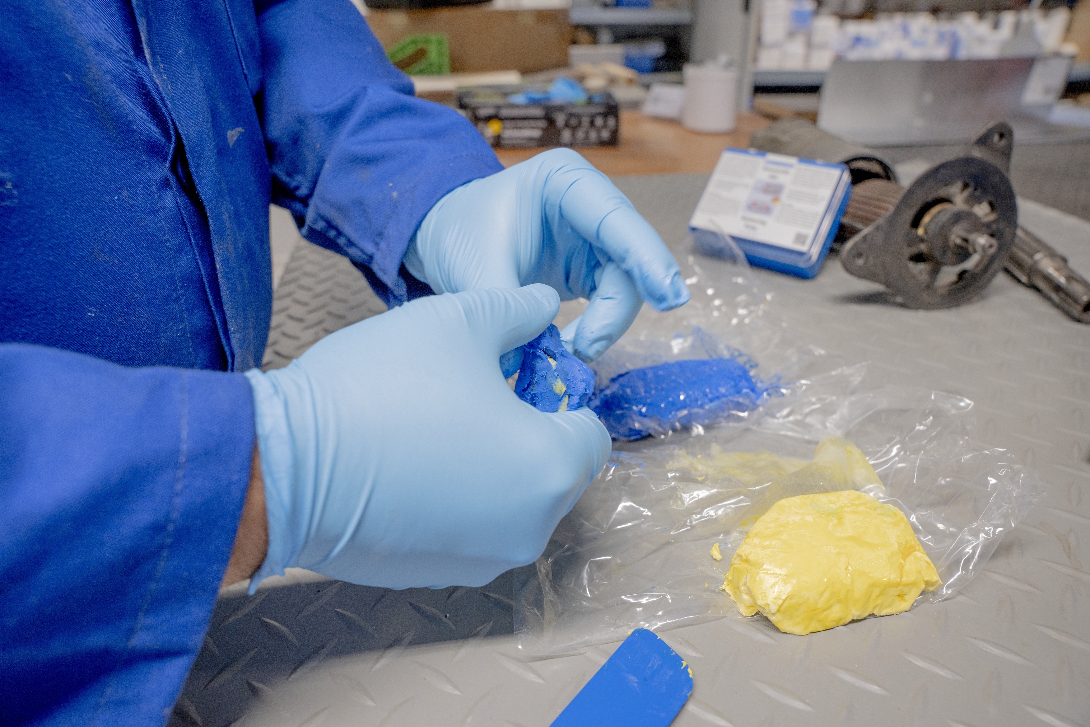 Mix both components until the compound has taken on a uniform green colour. If there are still blue or yellow inclusions, the compound has not been sufficiently mixed and requires further mixing.