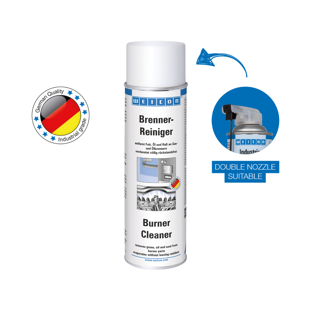 Le Nettoie-Brûleurs WEICON convient spécialement pour enlever les graisses, l'huile, la suie et d'autres encrassements sur les différentes parties de brûleurs. Le nettoyant s'évapore sans laisser de traces. Le spray s'utilise sur les porte-buses et les disques déflecteurs, sur les roues de ventilateurs et dans les boîtiers internes, les électrodes d'allumage etc.