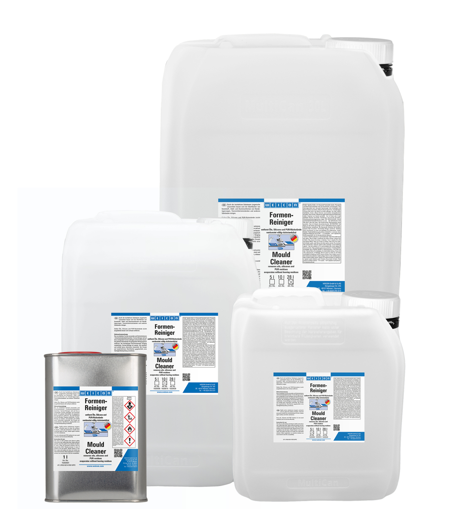 Le WEICON Nettoyant de Moules élimine efficacement les cires, silicones, huiles, résidus non durcis de PUR et autres impuretés de moules en matière plastique, en acier ou en aluminium.