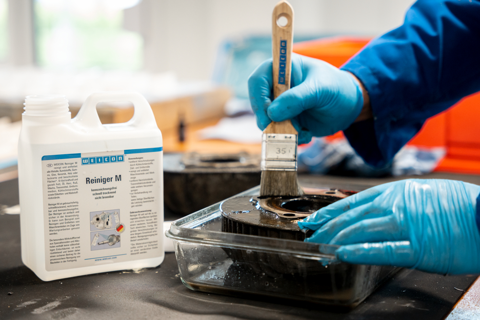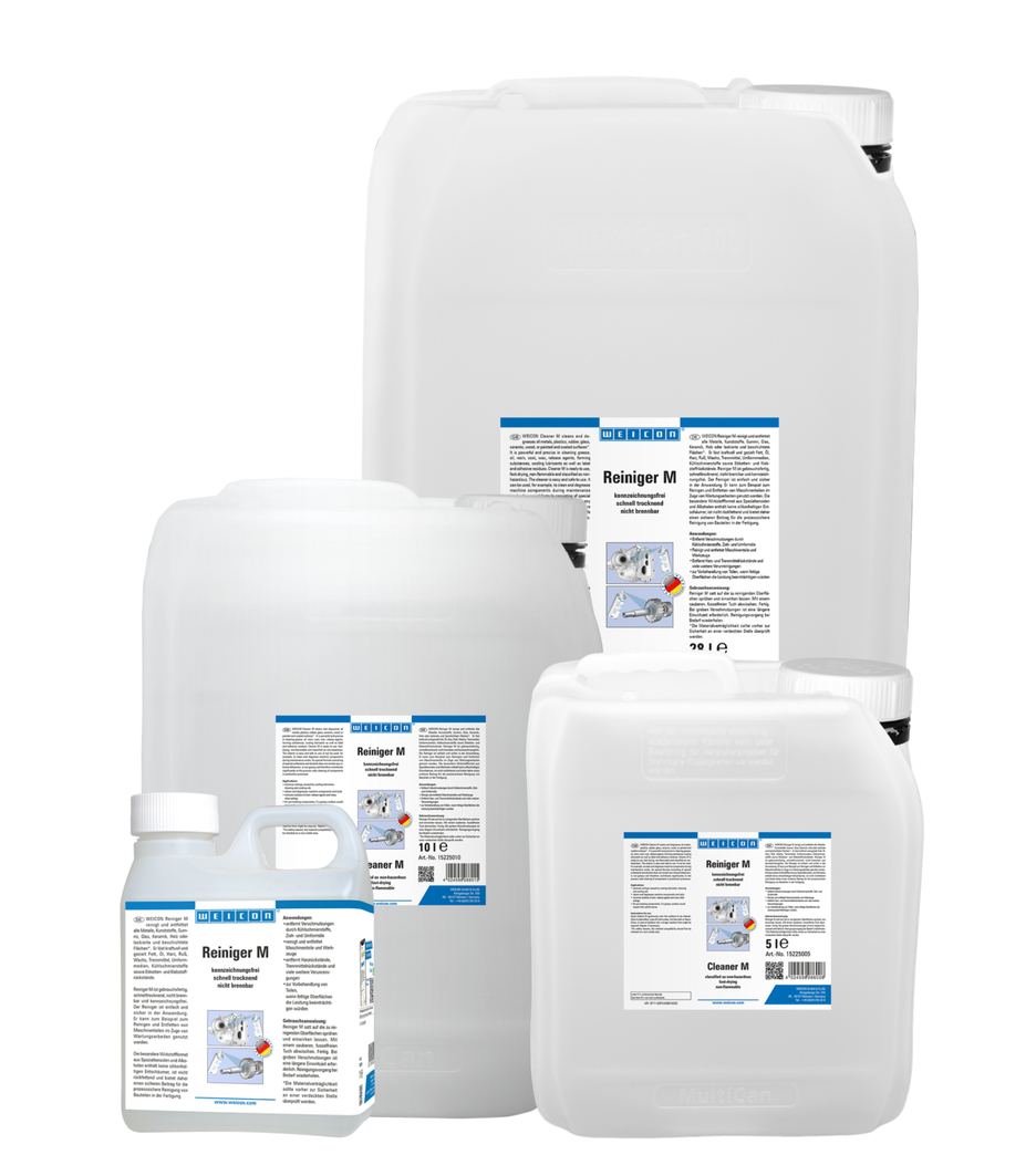 Le WEICON Nettoyant M nettoie et dégraisse tous les métaux, les matières synthétiques, le caoutchouc, le verre, la céramique, le bois ou les surfaces peintes et revêtues. Il dissout efficacement et de manière ciblée la graisse, l'huile, la résine, la suie, la cire, les agents de démoulage, les fluides de transformation, les lubrifiants de refroidissement ainsi que les résidus d'étiquettes et de colle. Le Nettoyant M est prêt à l'emploi, sèche rapidement, n'est pas inflammable et ne porte pas d'étiquette. Le nettoyant est simple et sûr à utiliser. Il peut par exemple être utilisé pour nettoyer et dégraisser des pièces de machines et des outils. Sa formule active particulière à base d'agents tensioactifs spéciaux et d'alcools ne contient pas d'agents antimousse à base de silicone, n'est pas regraissante et offre donc une contribution sûre pour le nettoyage de pièces dans la production, en toute sécurité pour le processus.