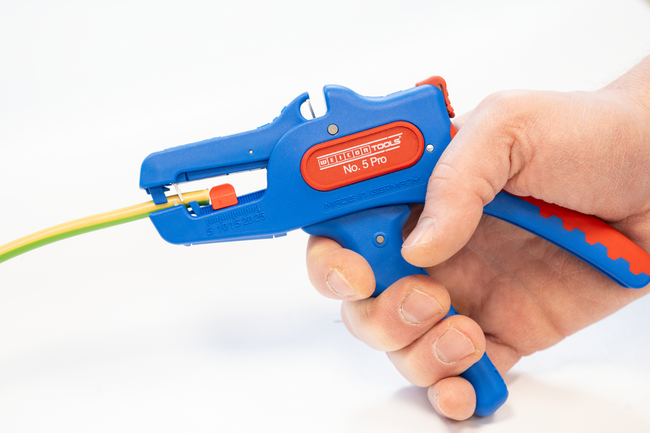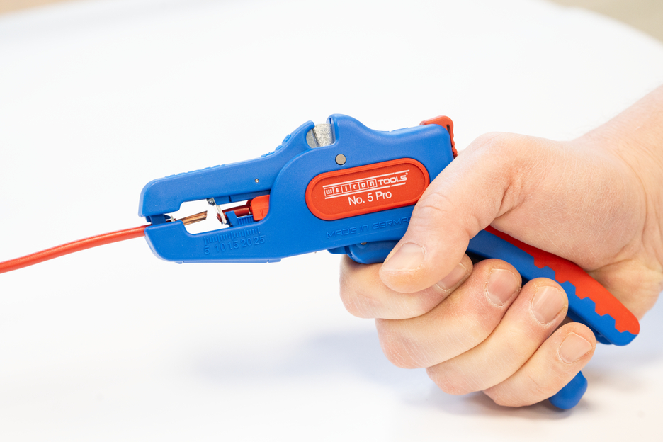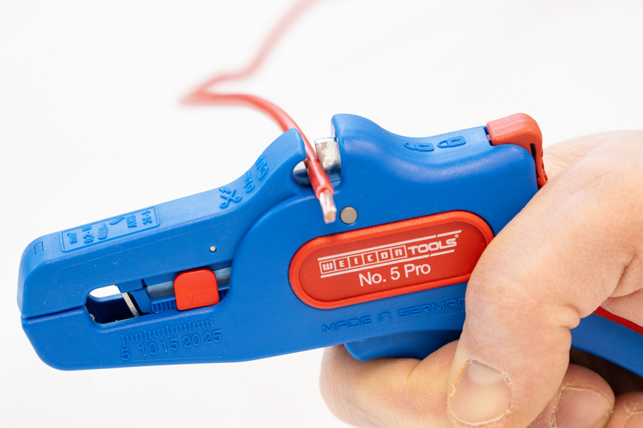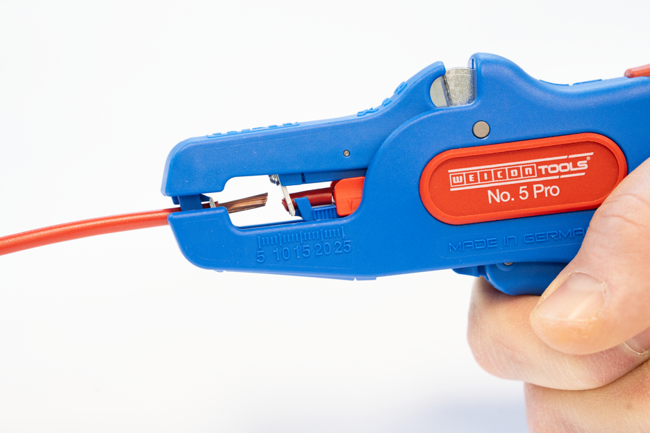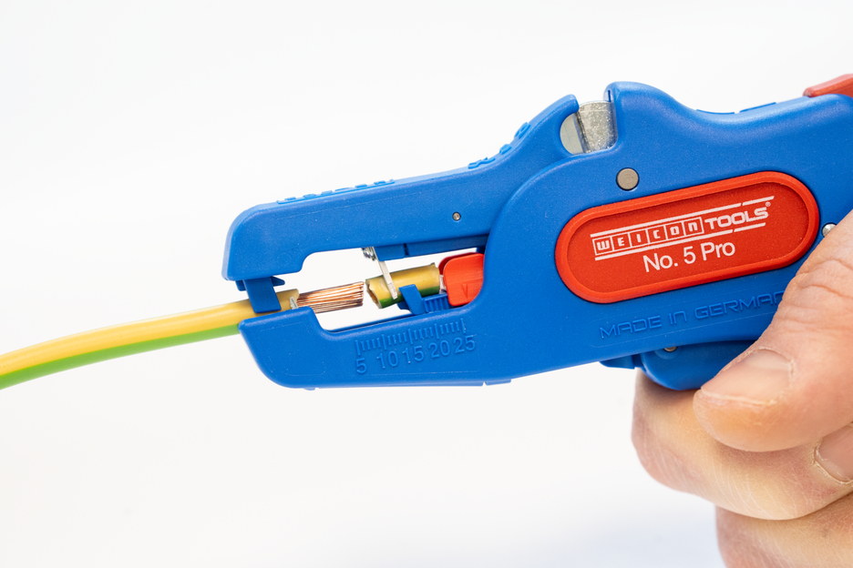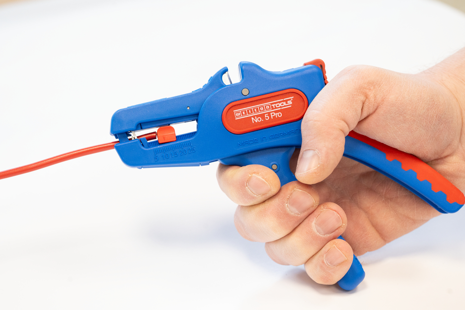 Pince à dénuder automatique pour dénudage de tous les conducteurs multibrins et monobrins courants (0,2 à 16 mm²). Grâce à une butée de longueur réglable de 5 à 25 mm, il est possible de travailler de manière très précise et exacte. La butée de réglage de la longueur peut être enlevée en cas de besoin. La pince s'adapte automatiquement à la section du conducteur - aucun réglage manuel n'est donc nécessaire. Une fonction de coup-fil a été intégré dans la pince. Elle convient aux conducteurs en cuivre et en aluminium d'un diamètre maximal de trois millimètres. Grâce à la construction compacte de l'outil, la pince peut également être utilisée dans des zones de travail difficiles d'accès, comme les armoires électriques. Le mécanisme de la pince est très fluide et s'est avéré durable et fiable lors de tests. La pince dispose d'une poignée multi-composants antidérapante au design bleu et rouge "Ice-Crack". La pince à dénuder est munie d'un œillet permettant d'attacher un ruban anti-chute et a été dotée d'une surface d'inscription permettant de personnaliser l'outil. De plus, la pince peut être verrouillée et rangé ainsi de manière peu encombrante.