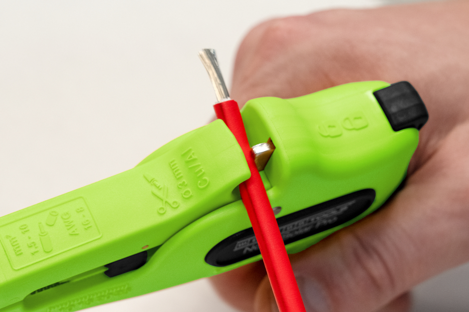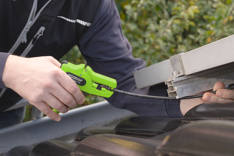 Outil spécial pour dénuder et isoler les câbles courants dans le domaine solaire I Grande plage de travail puissante de 1,5 mm² à 10 mm² I Travail précis grâce à la butée de longueur réglable (5 - 25 mm) I Pince coupante latérale intégrée et facilement accessible jusqu'à 3 mm Ø Cu/Al I Poignée multi-composants ergonomique et antidérapante