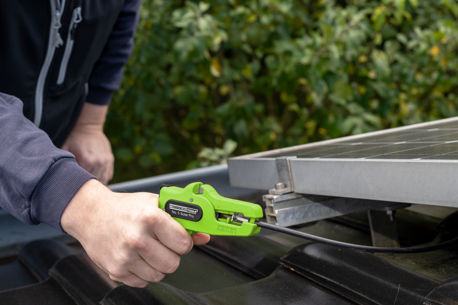 La pince automatique sert à dénuder tous les câbles solaires courants, comme par exemple H1Z2Z2-K de 1,5 à 10 mm². Grâce à une butée de longueur réglable de 5 à 25 mm, il est possible de travailler de manière très précise et exacte. Les lames de la Pince à Dénuder No. 5 Solar Pro ont été renforcées afin de pouvoir retirer sans problème les isolations caoutchoutées à plusieurs couches. La butée de réglage de la longueur peut être enlevée en cas de besoin. La pince s'adapte automatiquement à la section du conducteur - aucun réglage manuel n'est donc nécessaire. Une fonction de coup-fil a été intégré dans la pince. Elle convient aux conducteurs en cuivre et en aluminium d'un diamètre maximal de trois millimètres. Grâce à la construction compacte de l'outil, la pince peut également être utilisée dans des zones de travail difficiles d'accès, comme par exemple sur les modules solaires ou sur l'onduleur. Le mécanisme de la pince est très fluide et s'est avéré durable et fiable lors de tests. La pince dispose d'une poignée multi-composants antidérapante au design jaune et noir "Ice-Crack". La pince à dénuder est munie d'un œillet permettant d'attacher un ruban anti-chute et a été dotée d'une surface d'inscription permettant de personnaliser l'outil. De plus, la pince peut être verrouillée et rangé ainsi de manière peu encombrante. Comme pour toutes les pinces à dénuder de la ligne de produits No. 5, les lames électro-zinguées sont échangeables.