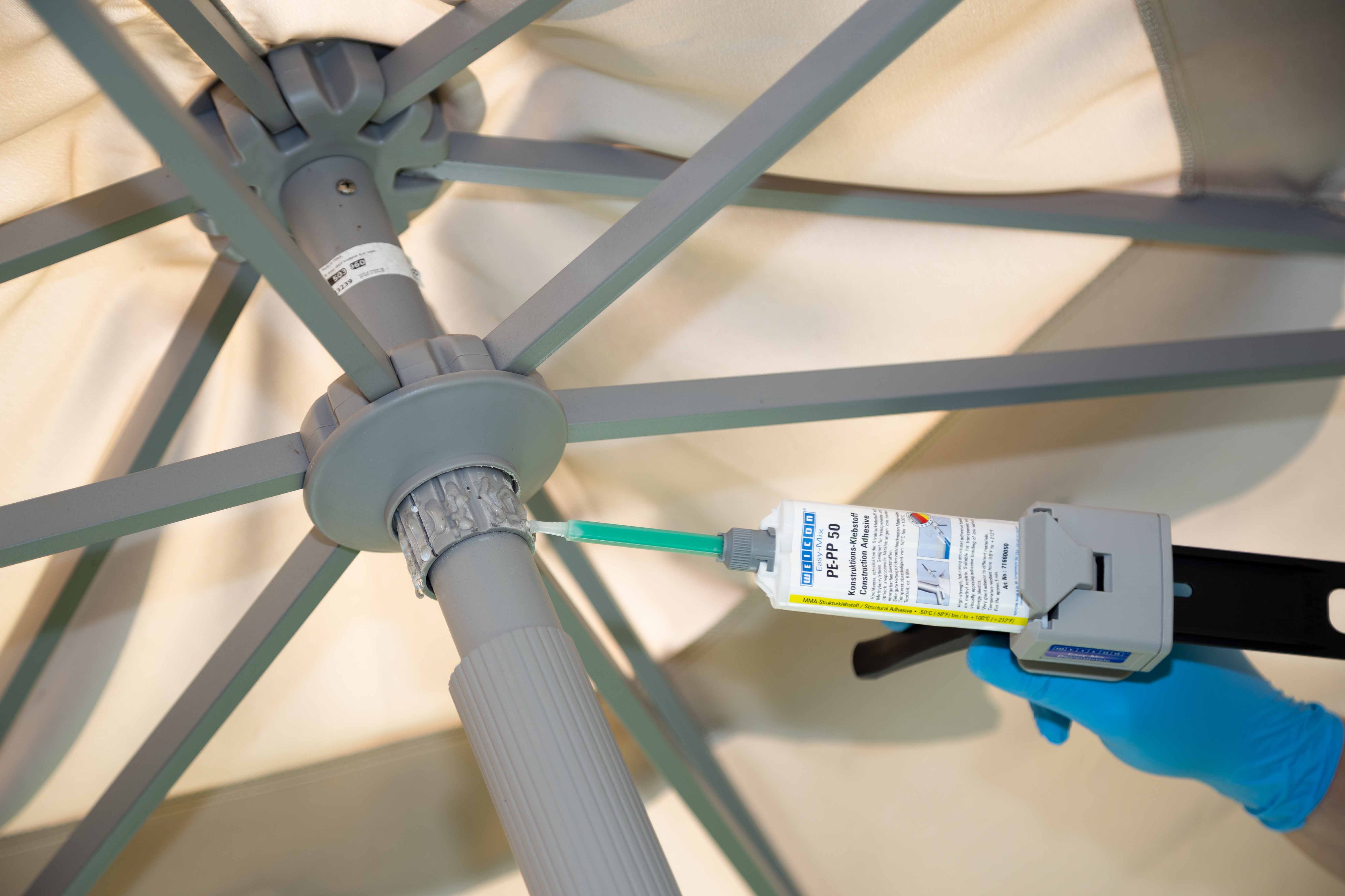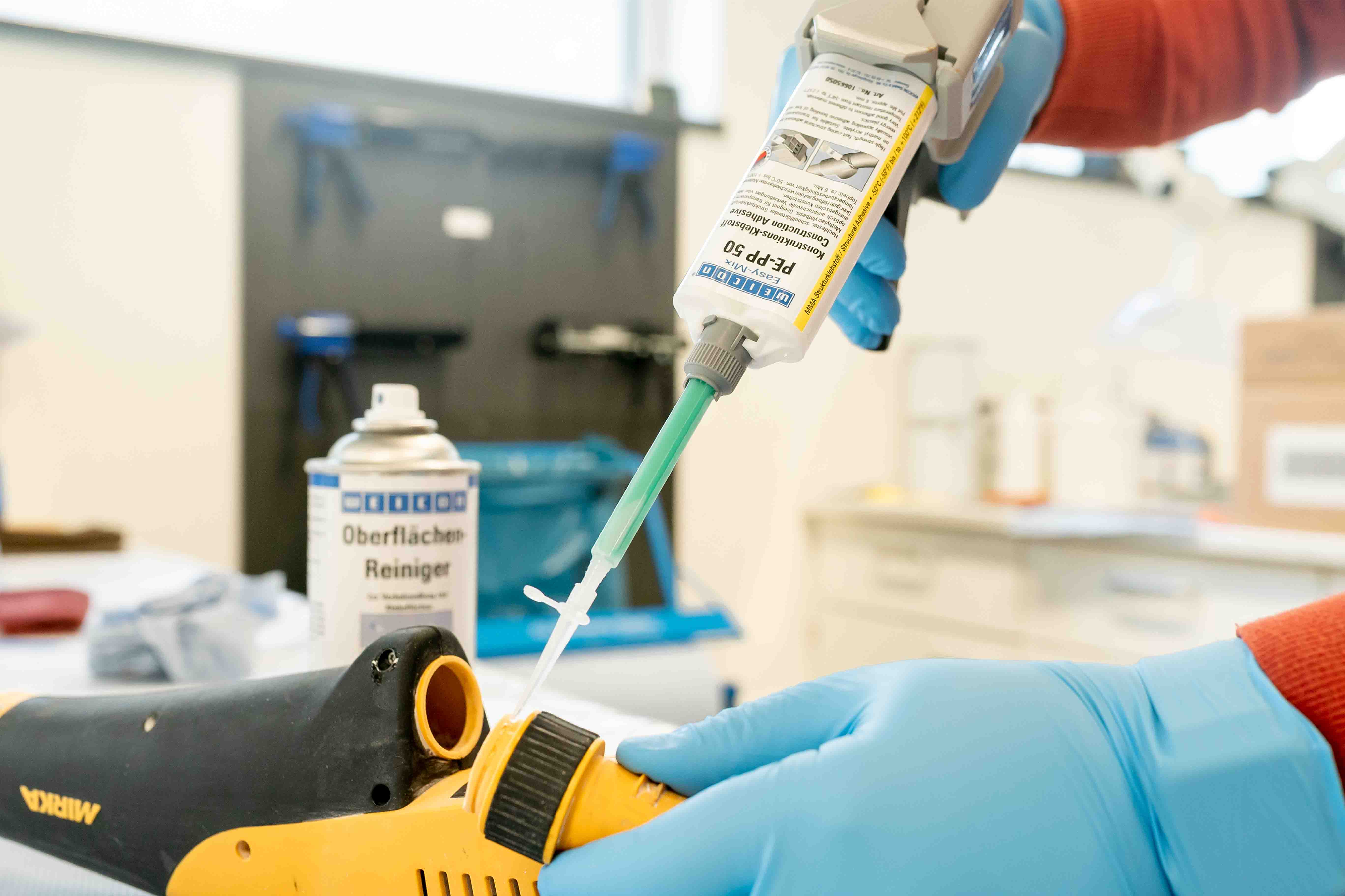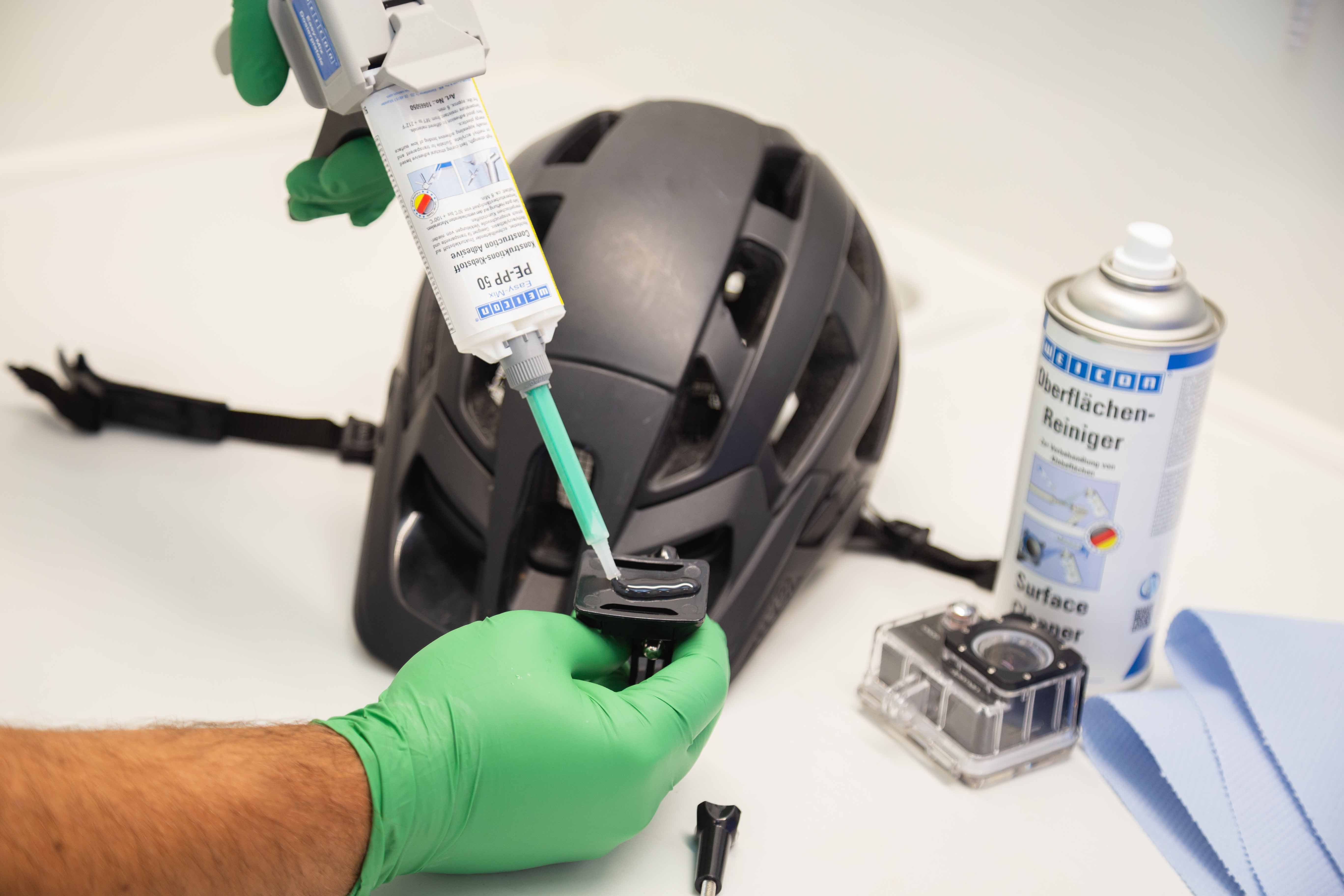 ✓ Choisir la bonne colle, par ex. WEICON Easy-Mix PE-PP 50 à base d'acrylate de méthyle, WEICON Plastique-Bond ou l'une de nos colles instantanées.