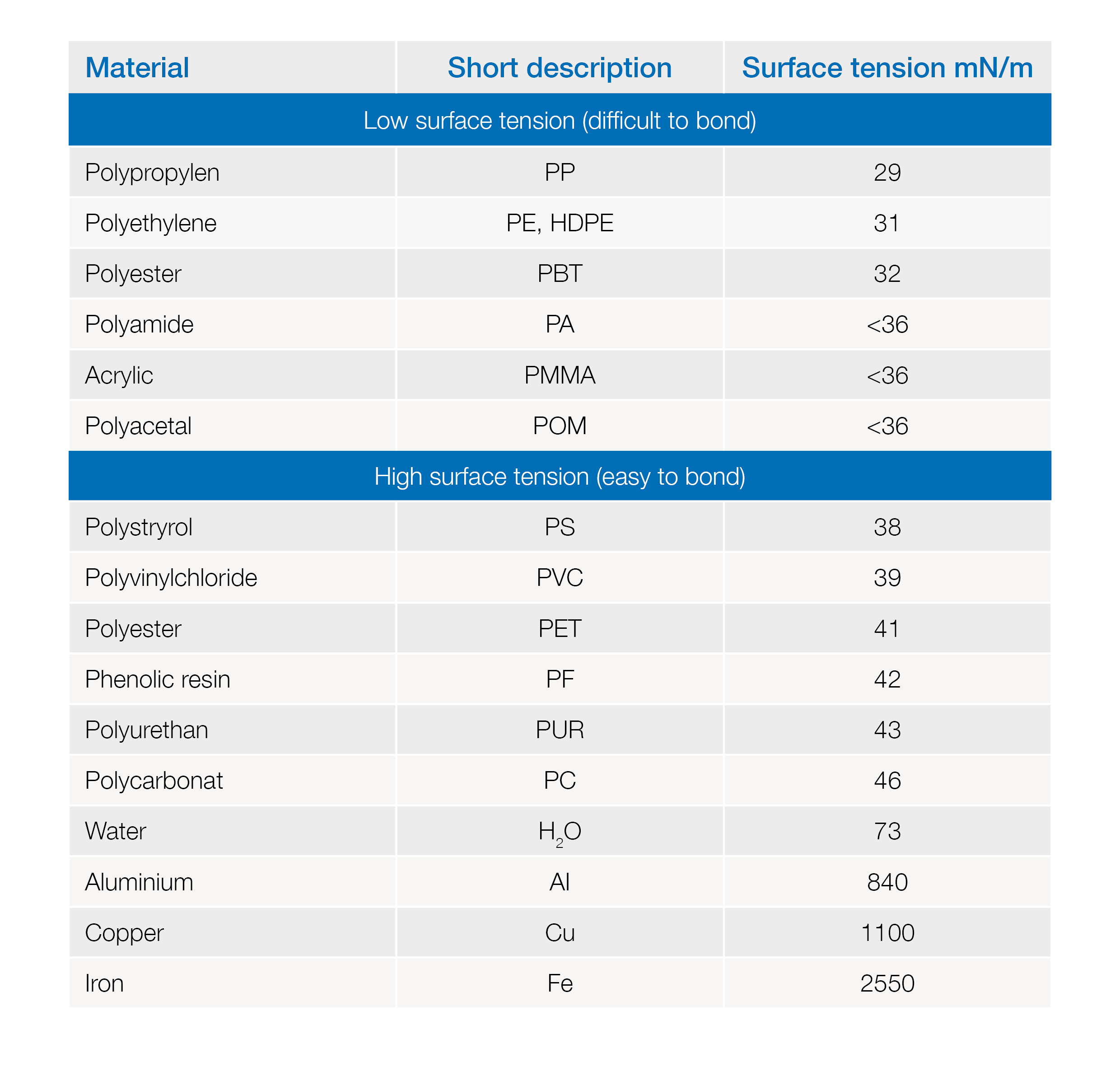 Voici un aperçu des matières plastiques et de leur tension de surface. Les matières plastiques faciles à coller sont donc le PVC ou le polycarbonate.