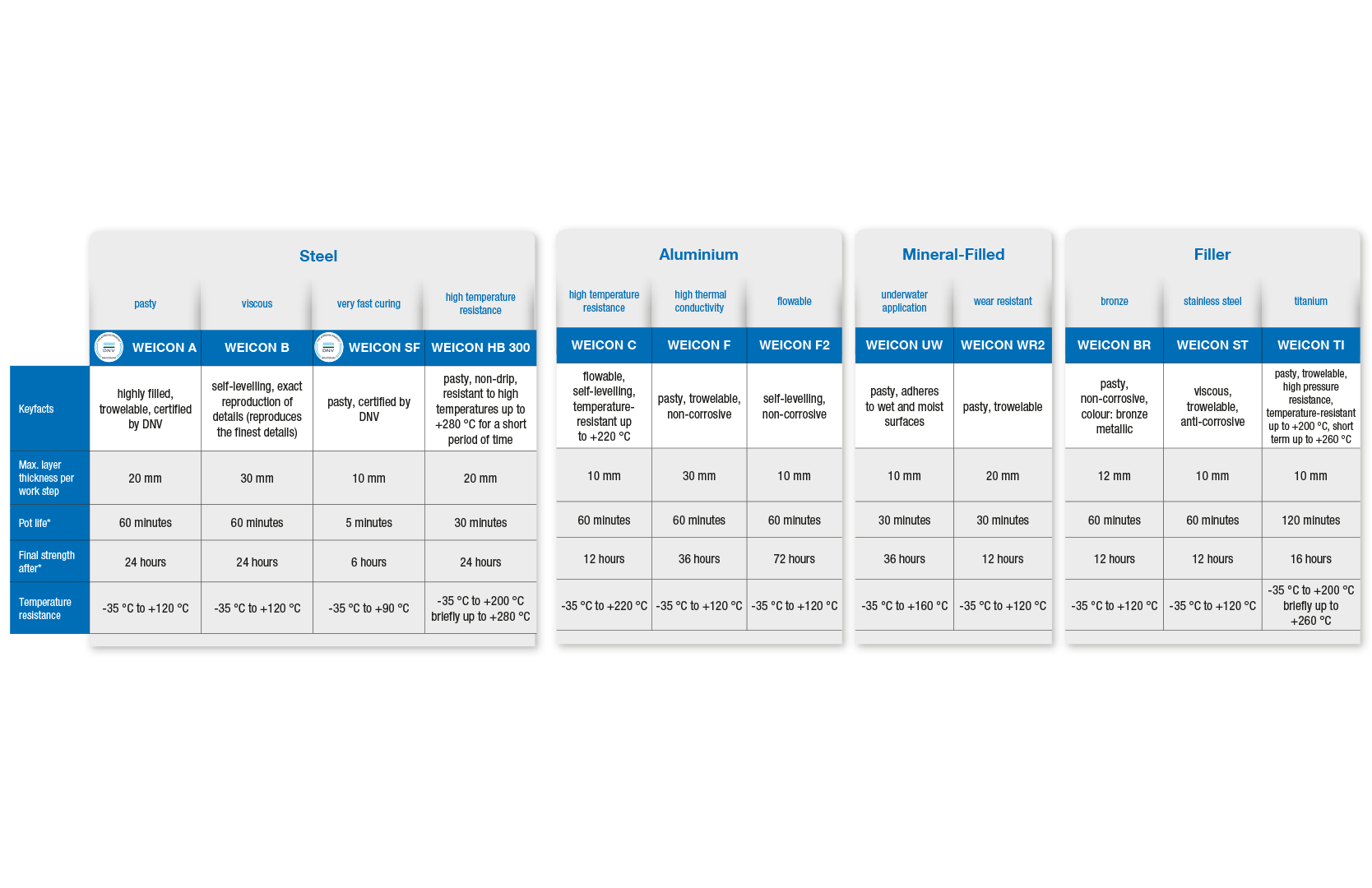 WEICON propose toute une série de produits qui peuvent être utilisés comme masse de scellement, pour le doublage et le rebasage ainsi que pour l'égalisation des fentes. En outre, ils sont utilisés dans la fabrication de prototypes ou de dispositifs de retenue. Les produits spéciaux peuvent également être utilisés pour réparer des convoyeurs, des glissières ou des rails de guidage. Les résines époxy apportent un remède dans la construction métallique, la construction de voies ferrées, sur les grues et dans la réparation de ponts. Les avantages de ces systèmes de réparation sont une grande fluidité, une adhérence élevée ainsi qu'une très bonne résistance à la pression. Elles offrent en outre une protection anticorrosion de longue durée.