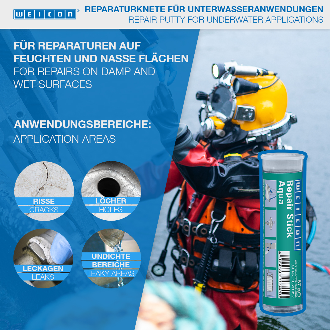 Idéal pour les réparations rapides sur les surfaces humides et mouillées, ainsi que pour les applications sous l'eau. Pour réparer et colmater les fissures, les trous, les fuites et les défauts d'étanchéité sur les réservoirs d'essence et d'eau, les radiateurs, les installations de distribution électrique, les équipements sanitaires et dans les piscines. WEICON Repair Stick Aqua peut être utilisé dans le domaine de la plomberie et du chauffage, dans le domaine électrique, dans le domaine maritime et dans de nombreux autres domaines de l'industrie.