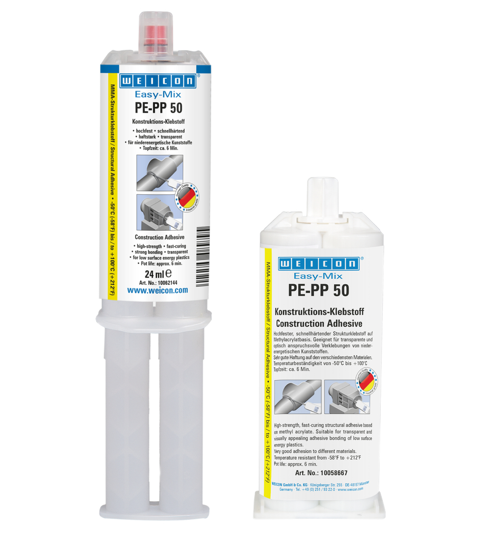 WEICON Easy-Mix PE-PP 50 est une colle structurale bicomposante à base de méthacrylate. Grâce à son durcissement transparent, elle est particulièrement adaptée aux collages très résistants et exigeants sur le plan optique de matières plastiques à faible énergie, comme le PE, le PP et le TPE. Grâce à sa formulation spéciale, la colle est adaptée aux jeux de collage très faibles voire nul et pour le collage de substrats avec des jeux de collage extrêmement petites, inférieures à 0,2 mm. La colle structurale présente un développement rapide de la résistance et une résistance finale élevée. Elle est résistante aux chocs, au vieillissement, aux produits chimiques et légèrement thixotrope. Le PE-PP 50 dispose d'une courte durée de vie en pot de six minutes et d'un temps de travail de douze minutes. Il est appliqué dans un système 1:1 et aucun traitement préalable des pièces à coller n'est nécessaire, car la colle dispose d'un primaire intégré. Pour l'application des produits Easy-Mix en 50 ml, le pistolet de dosage Easy-Mix D 50 est nécessaire.