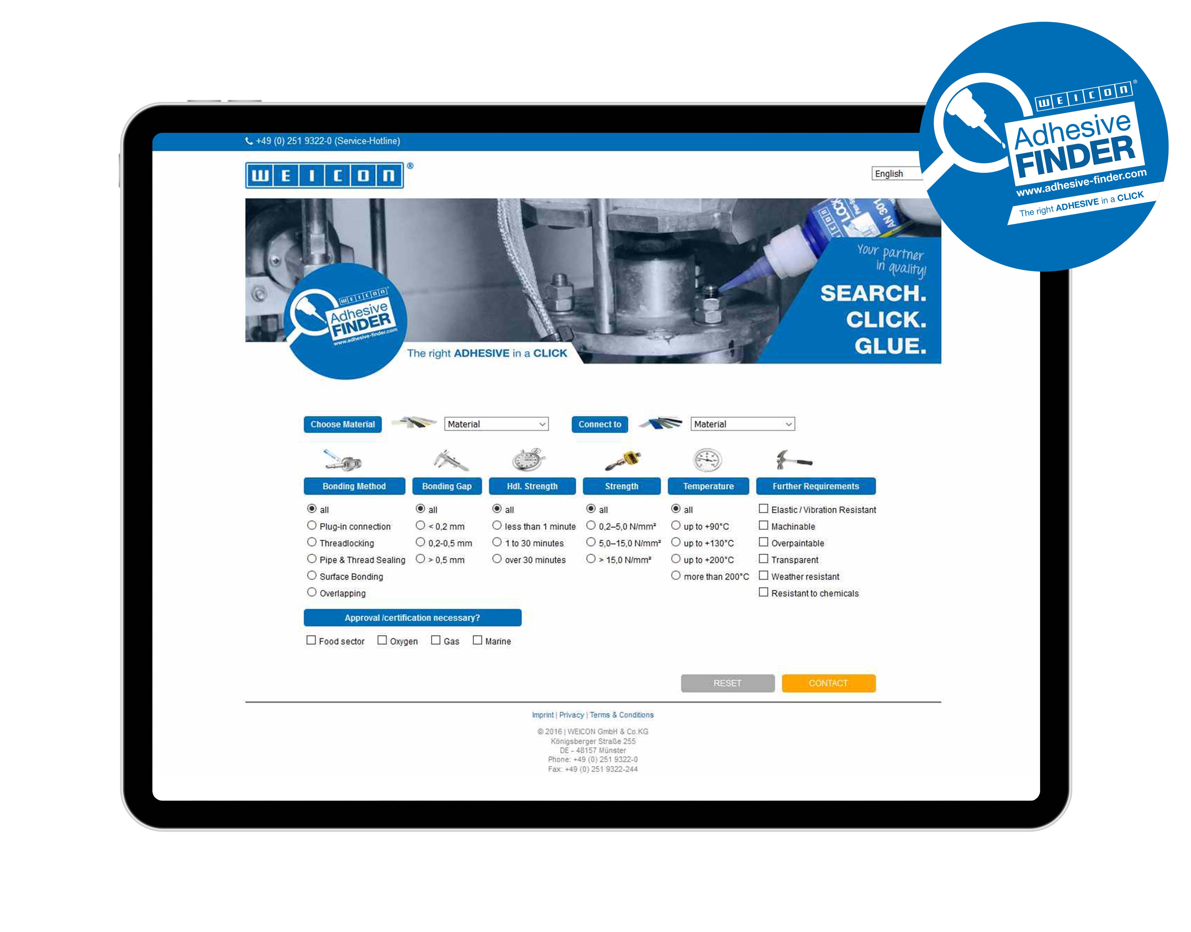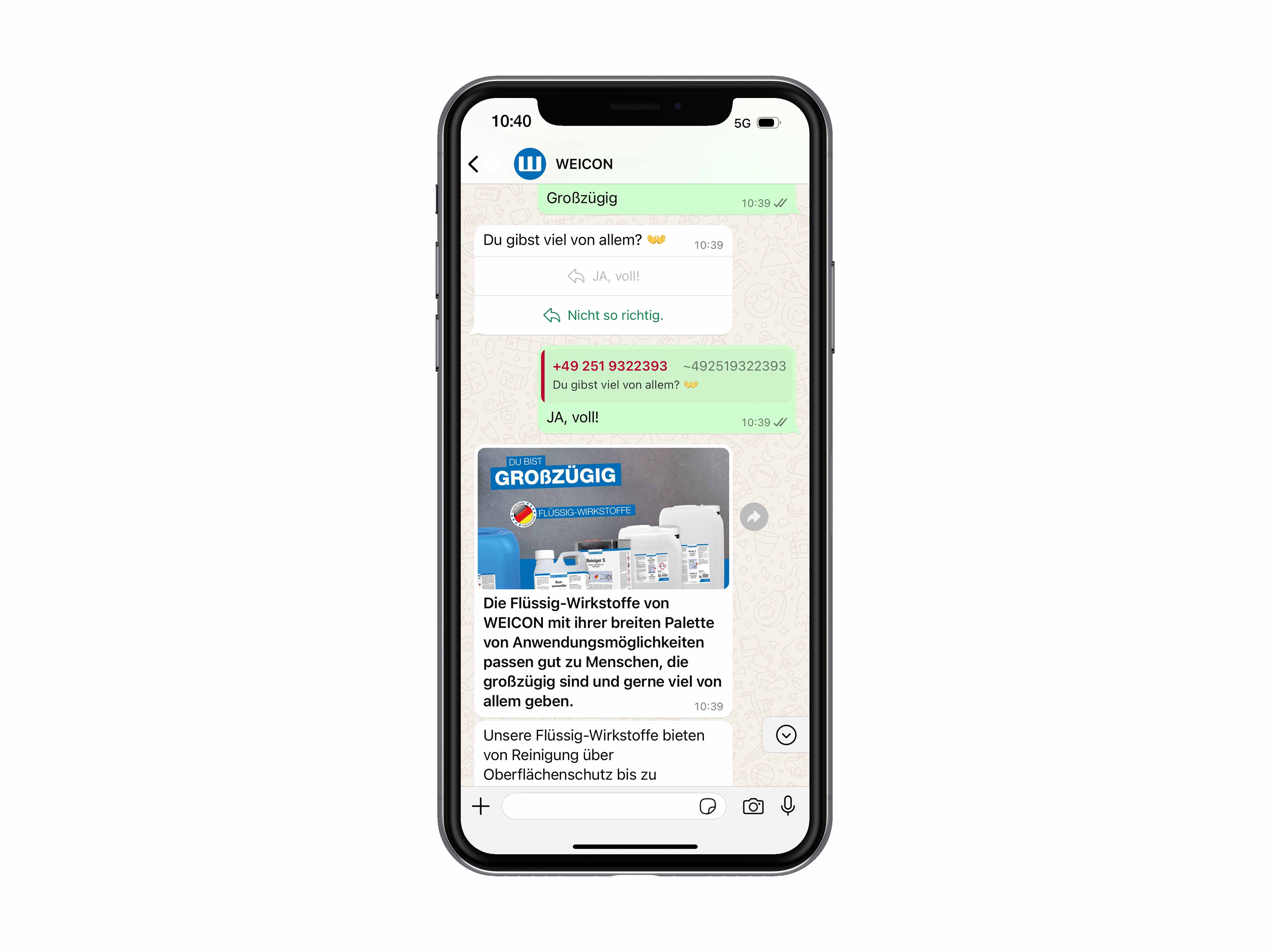 Vous vous intéressez à nos produits en général ? Mais vous ne savez pas, par exemple, si vous préférez utiliser une huile ou une graisse lubrifiante, une colle monocomposante ou bicomposante ou s'il vous manque encore le bon outil ? Alors informez-vous à l'aide de notre service WhatsApp ou faites notre test « Quel type de WEICON suis-je » ? test sur WhatsApp.