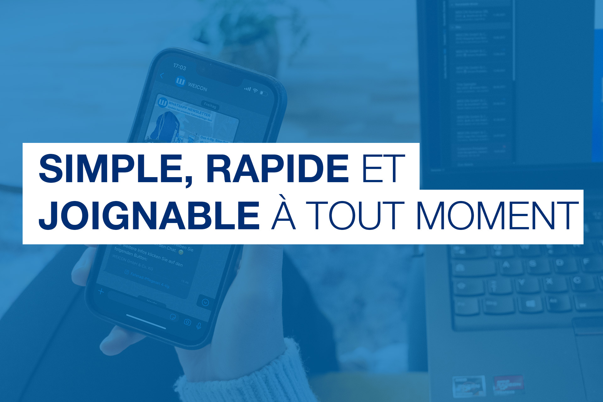 Vous souhaitez nous contacter à tout moment et partout, nous envoyer des photos de votre application ou utiliser le TOOLS-Finder de WEICON ? Vous avez des questions sur nos produits, vous cherchez rapidement l'interlocuteur adéquat ou vous souhaitez commander facilement par WhatsApp ? Nous avons rendu tout cela possible pour vous ! Utilisez notre service WhatsApp ou abonnez-vous à notre newsletter WhatsApp ou à notre nouveau canal WhatsApp.