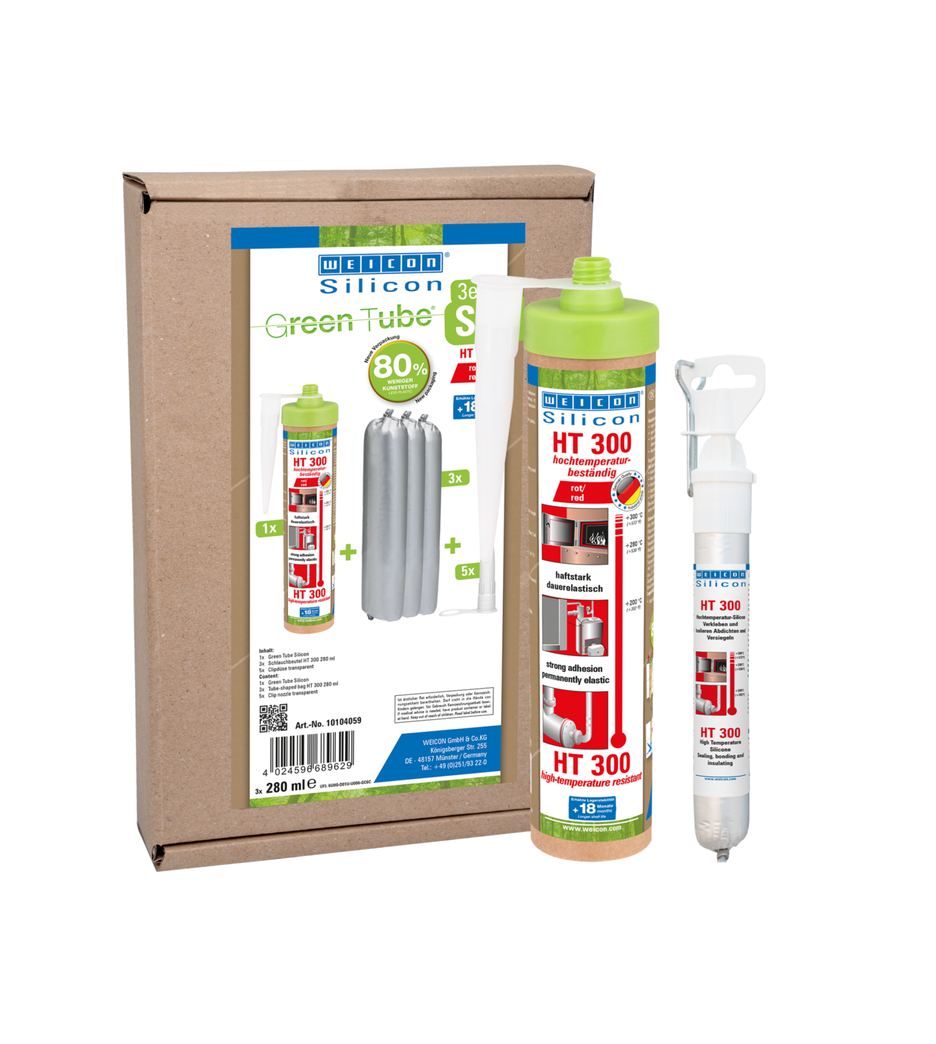 WEICON HT 300 a une haute résistance thermique (+300 °C/+572 °F), exempt de solvants, fortement adhésif, à réticulation acétique, résistant aux intempéries, au vieillissement et aux agents chimiques et extrêmement élastique (allongement à la rupture d'env. 300%). Il convient particulièrement pour les collages et les scellements exposés à la chaleur et adhère très bien à l'acier, à l'aluminium, au verre, à la céramique et à de nombreux autres matériaux. Le scellant adhésif s'utilise dans des fours industriels, des installations pour gaz de fumées, des installations de chauffage des conduits de fumées, des armoires chauffantes et dans beaucoup d'autres domaines.