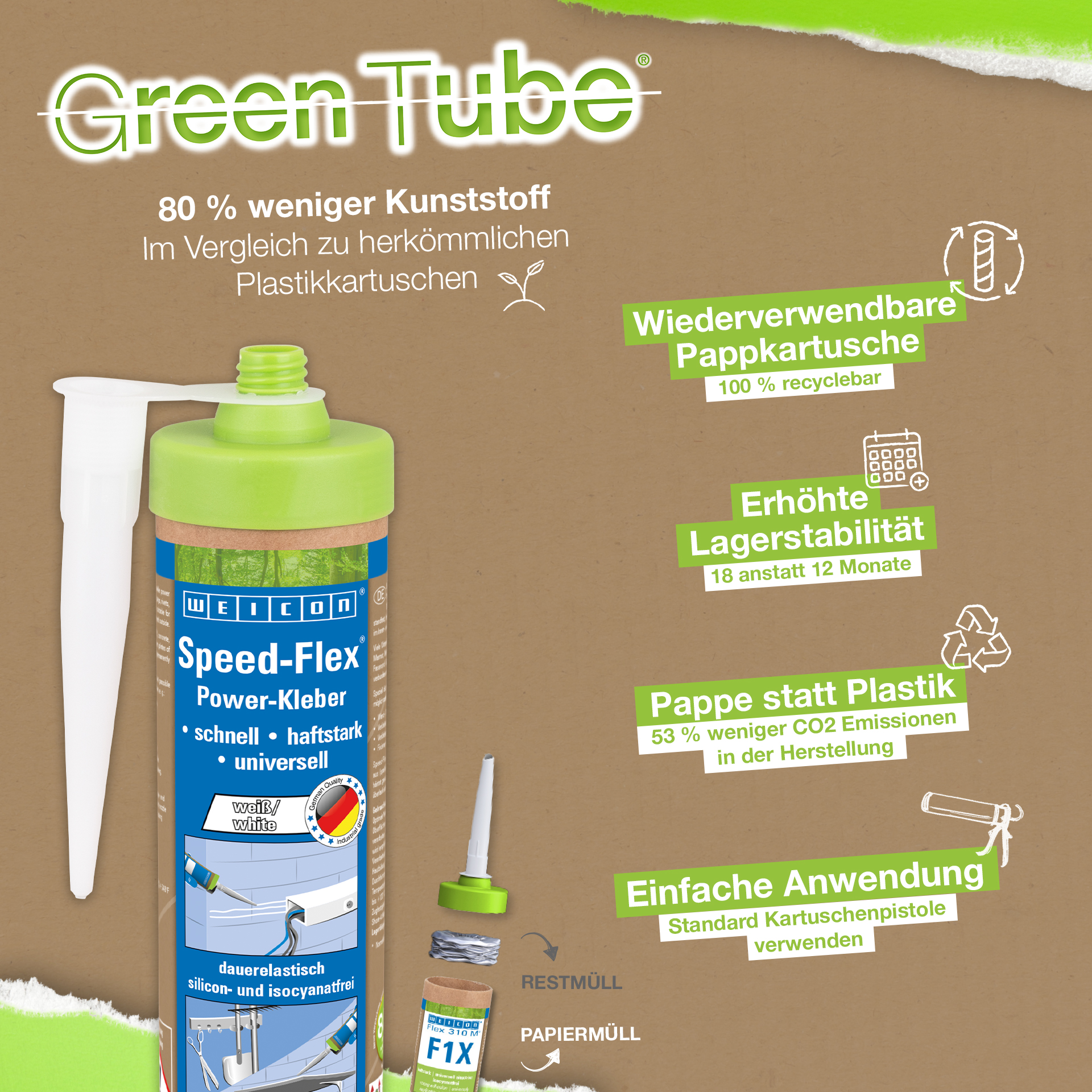 Speed-Flex est fortement adhésif, pâteux et stable, peut être peint «mouillé sur mouillé», résiste au vieillissement, aux intempéries, aux UV et est exempt de silicones, d‘isocyanates, d‘halogènes et de solvants. Speed-Flex est certifié ISEGA et s‘utilise comme adhésif en technologie alimentaire. Le scellant adhésif a une base de polymères MS avec une adhérence initiale extrêmement forte et convient pour coller des métaux, de nombreuses matières plastiques, la céramique, le bois, le verre et la pierre. Speed-Flex remplace les méthodes de fixation traditionnelles comme les vis, les chevilles, les rivets etc. Grâce à sa très forte adhérence initiale, il permet de coller même sur des surfaces verticales à l‘intérieur et à l‘extérieur. Le produit s‘utilise dans la construction sèche et l‘agencement intérieur, la construction métallique, la chaudronnerie, la construction d‘appareils, la ventilation et de la climatisation, la construction de stands d‘exposition et l‘agencement de magasins et partout où les silicones ou les produits siliconés sont inappropriés.