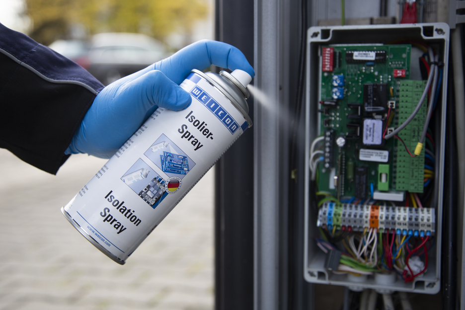 WEICON Spray d’Isolation est un vernis transparent d’isolation et de recouvrement à base de résine acrylique. Il forme un film flexible et résistant qui adhère parfaitement à presque tous les matériaux courants tels que le métal, le verre, le plastique ou le bois. WEICON Spray d’Isolation est résistant contre les rayons UV, aux acides, aux huiles et aux alcalis. Il résiste à l'humidité et aux intempéries et se caractérise en particulier par sa grande rigidité diélectrique. Cet aérosol protège contre l’humidité et de vapeurs divers. Il sert de couche protectrice sur les connexions électriques, les interrupteurs, les appareillages de commutation, les composants électroniques et les bobines, de produit d'étanchéité universel pour l'électrotechnique ou pour la réparation des isolants des moteurs électriques, des enroulements et des cadres.
