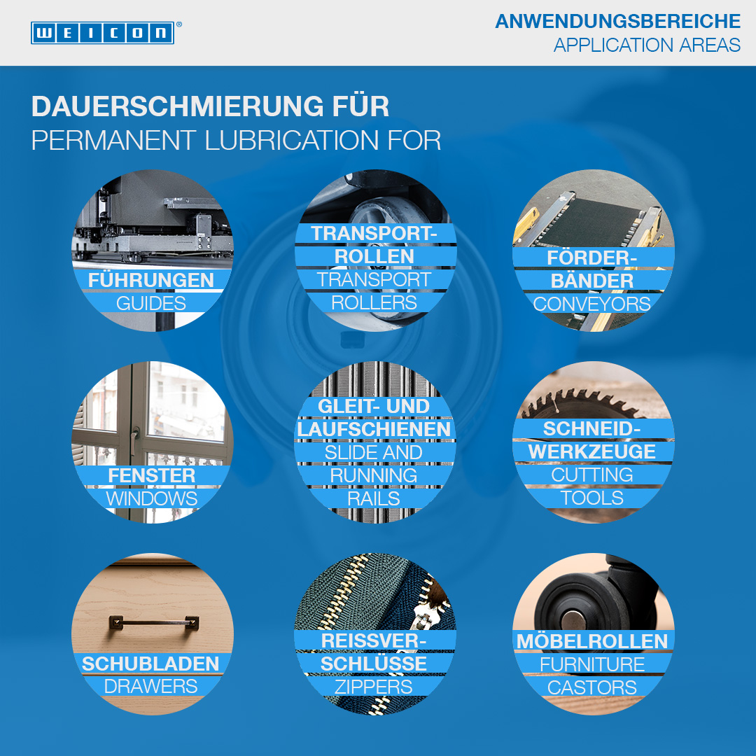 Le Spray PTFE WEICON est un lubrifiant à sec exempt de graisse avec effet antiadhésif simultané à base de PTFE. Le Spray PTFE adhère à toutes les surfaces métalliques, en plastiques et en bois. Sa haute teneur en PTFE réduit nettement le coefficient de frottement. Le revêtement est antisalissant, antipoussière, hydrofuge et résistant aux huiles, aux graisses et à de nombreux produits chimiques. Le Spray PTFE WEICON s‘utilise comme lubrifiant permanent sur les glissières et rails de roulement ainsi que sur les guidages, convoyeurs à bande, rouleaux de transport et toboggans, sur les fenêtres, outils de coupe et machines d‘emballage. Il convient aussi comme revêtement hydrofuge de joints en papier et en liège ainsi que de garnitures d‘étanchéité, au lieu d‘agents séparateurs au silicone et partout où ni l‘huile, ni la graisse ne sont autorisées ou souhaitables comme lubrifiants.