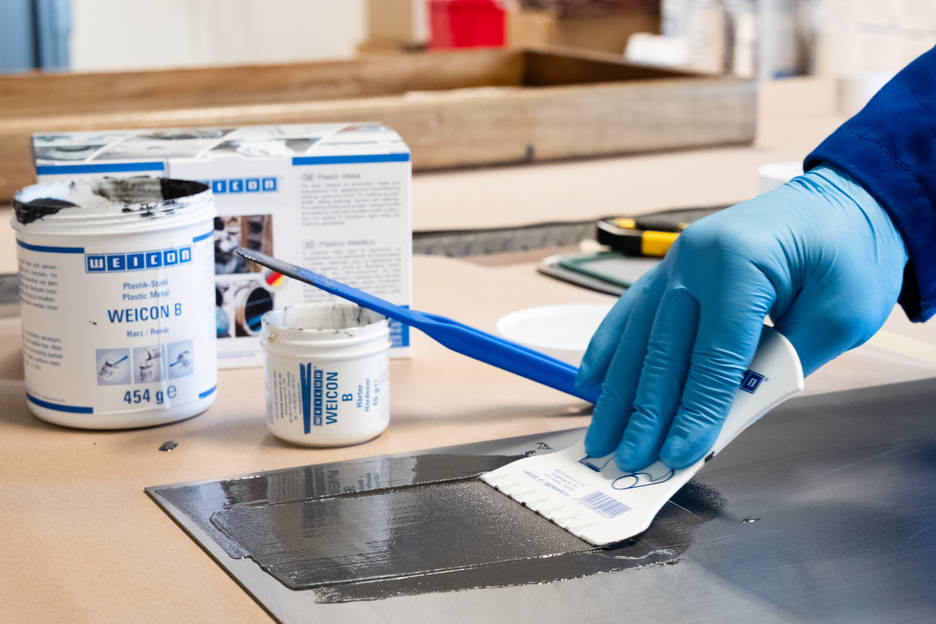 Le système de résine époxy WEICON B convient particulièrement pour reproduire des détails dans la construction de modèles et de moules, pour fabriquer des outils, des gabarits, des calibres et des dispositifs de serrage, pour remplir des retassures et des microporosités sur des pièces en fonte et acier, ainsi que pour des travaux de réparation généraux pour lesquels une masse de scellement chargé d’acier est avantageuse. Lors de la reconstruction de composants en acier fortement endommagés avec WEICON B, aucune déformation thermique ne se produit sur les composants et donc aucune perturbation de la structure métallique, comme c'est le cas avec le soudage par accumulation. WEICON B s'utilise dans la construction de machines, d'outils, de modèles, de moules et dans beaucoup d'autres domaines.